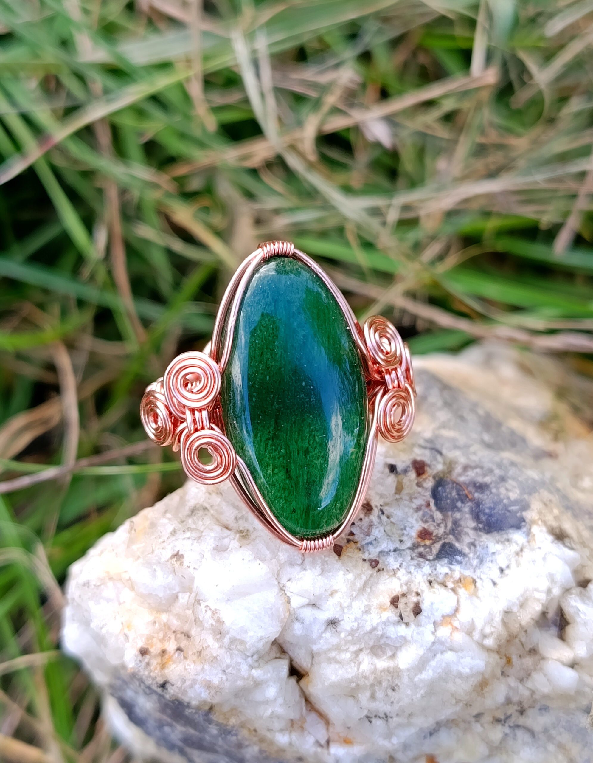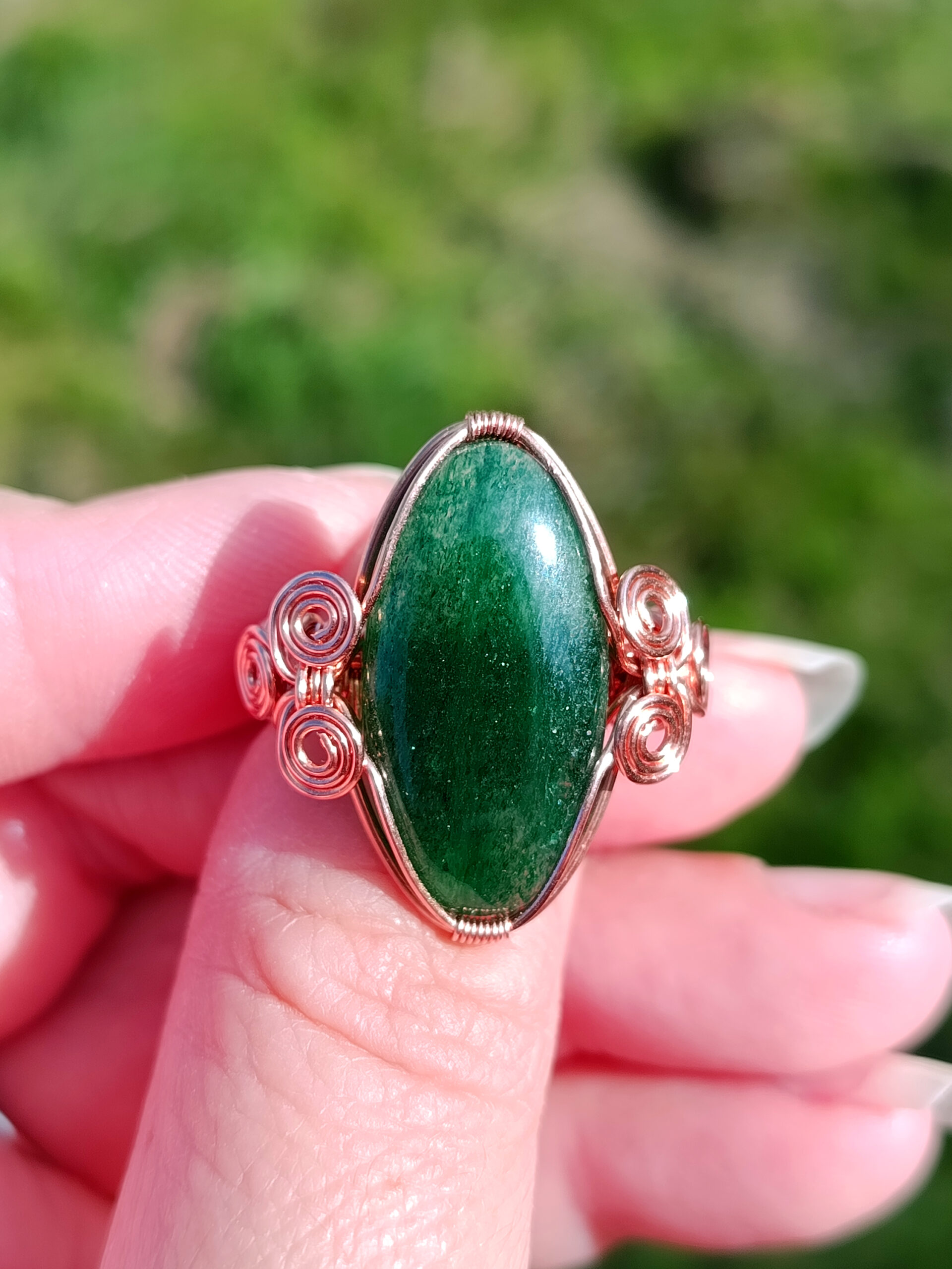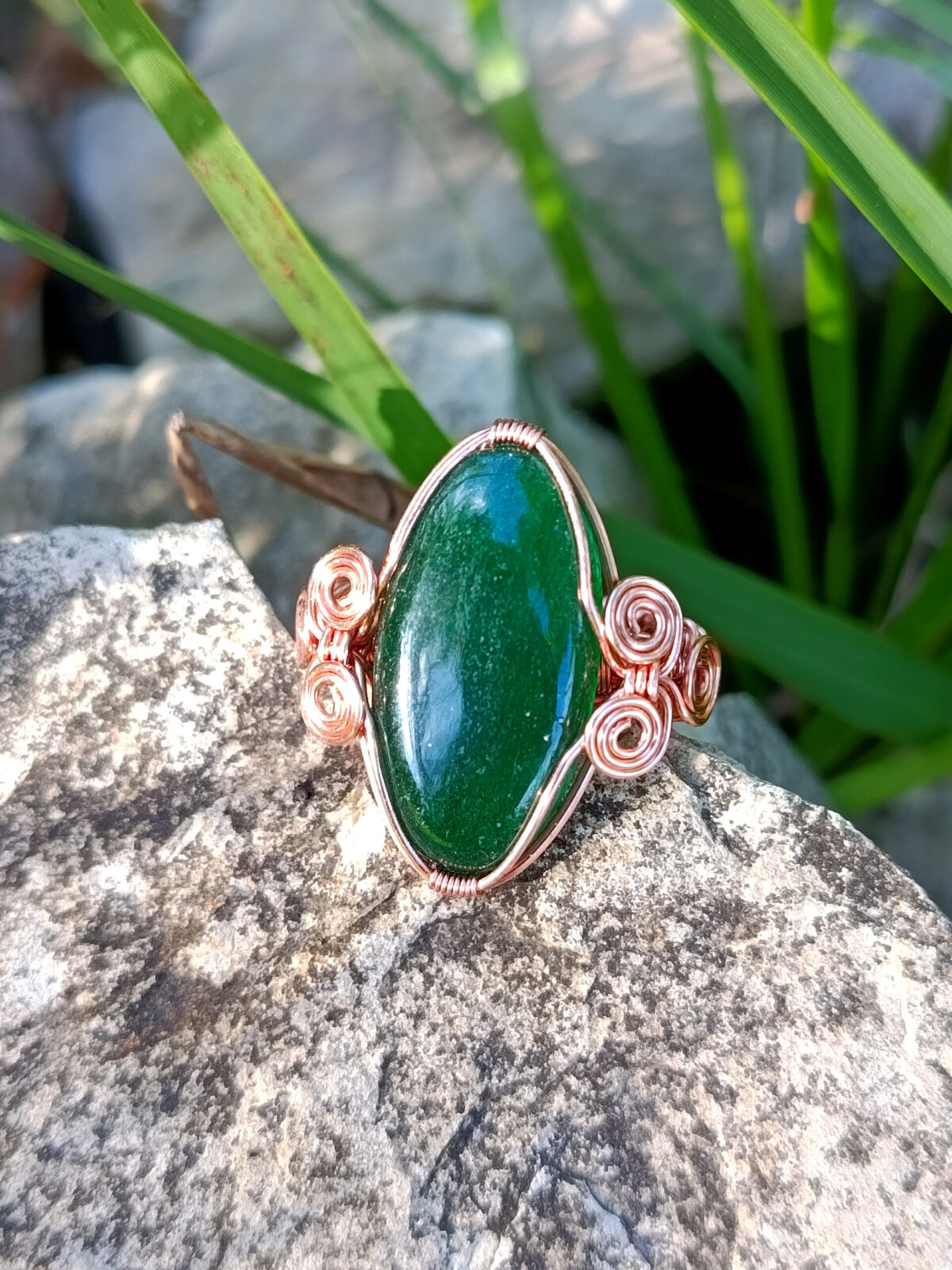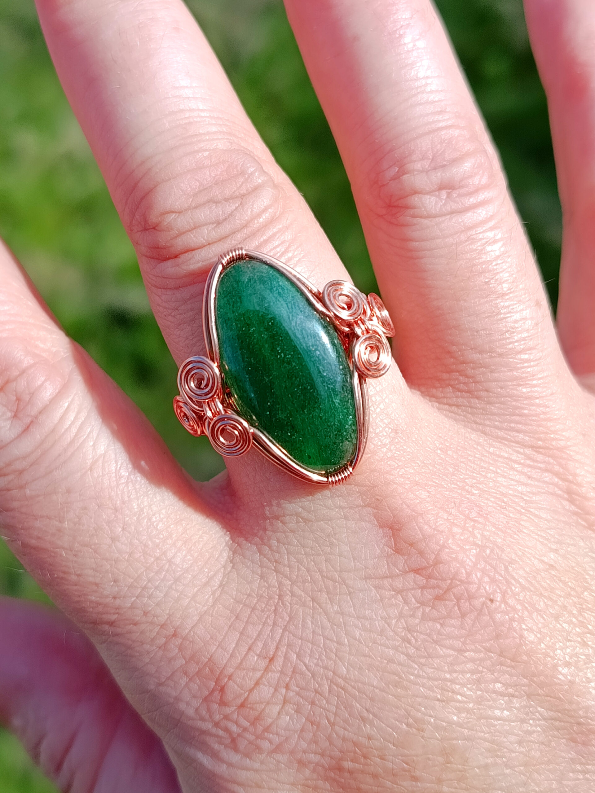 Jolie petite bague composé d’un cabochon d’aventurine serti sur fil de cuivre naturel.