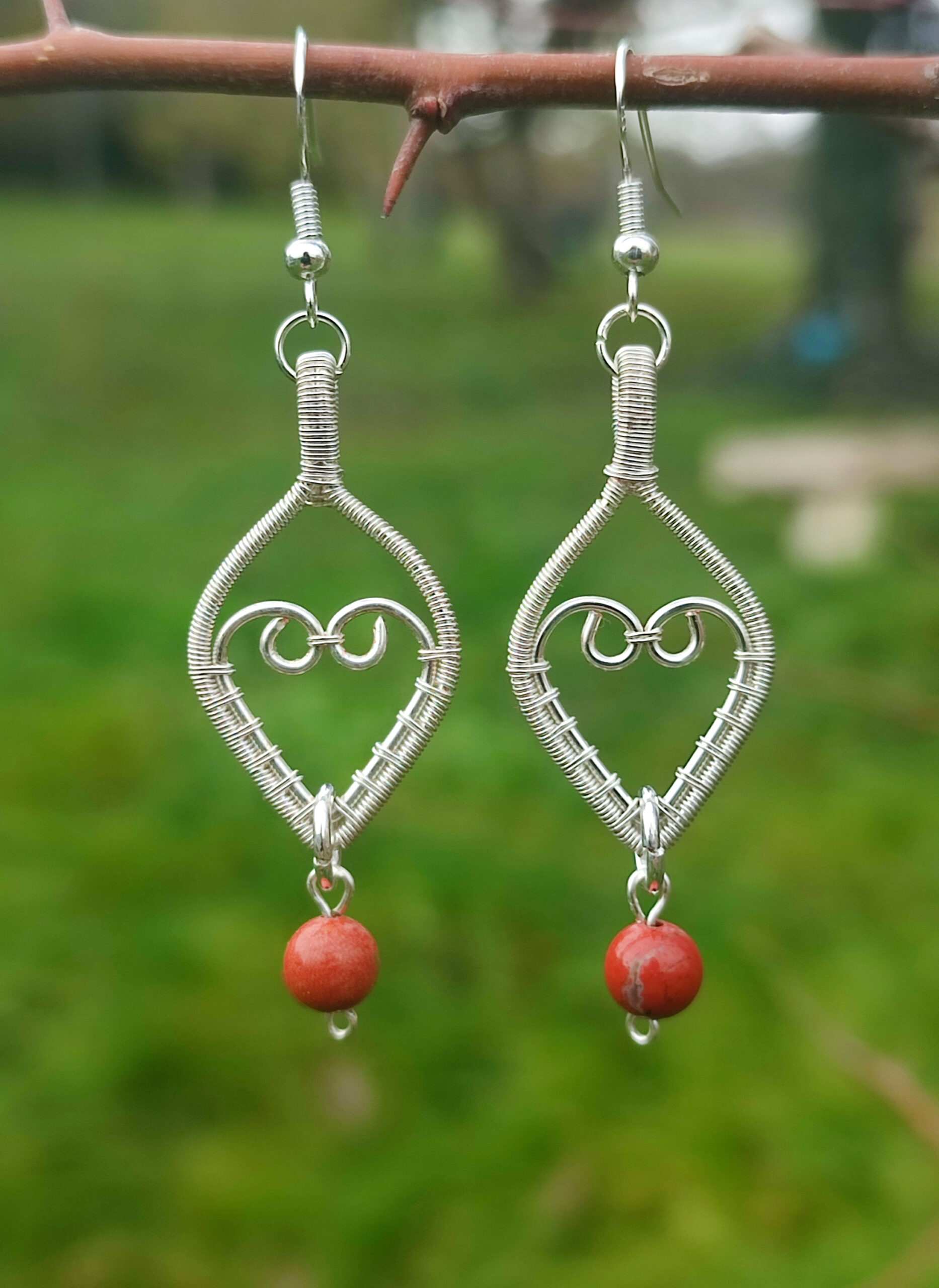 Ces jolies perles de 6mm en jaspe rouge ont été montées sur un beau petit montage en cuivre plaqué argent finement tissé, réalisé à la main. Avec leur belle couleur rouge brique et le joli cœur du montage, ces boucles d’oreilles rappelleront sans aucun doute le thème de l’amour !