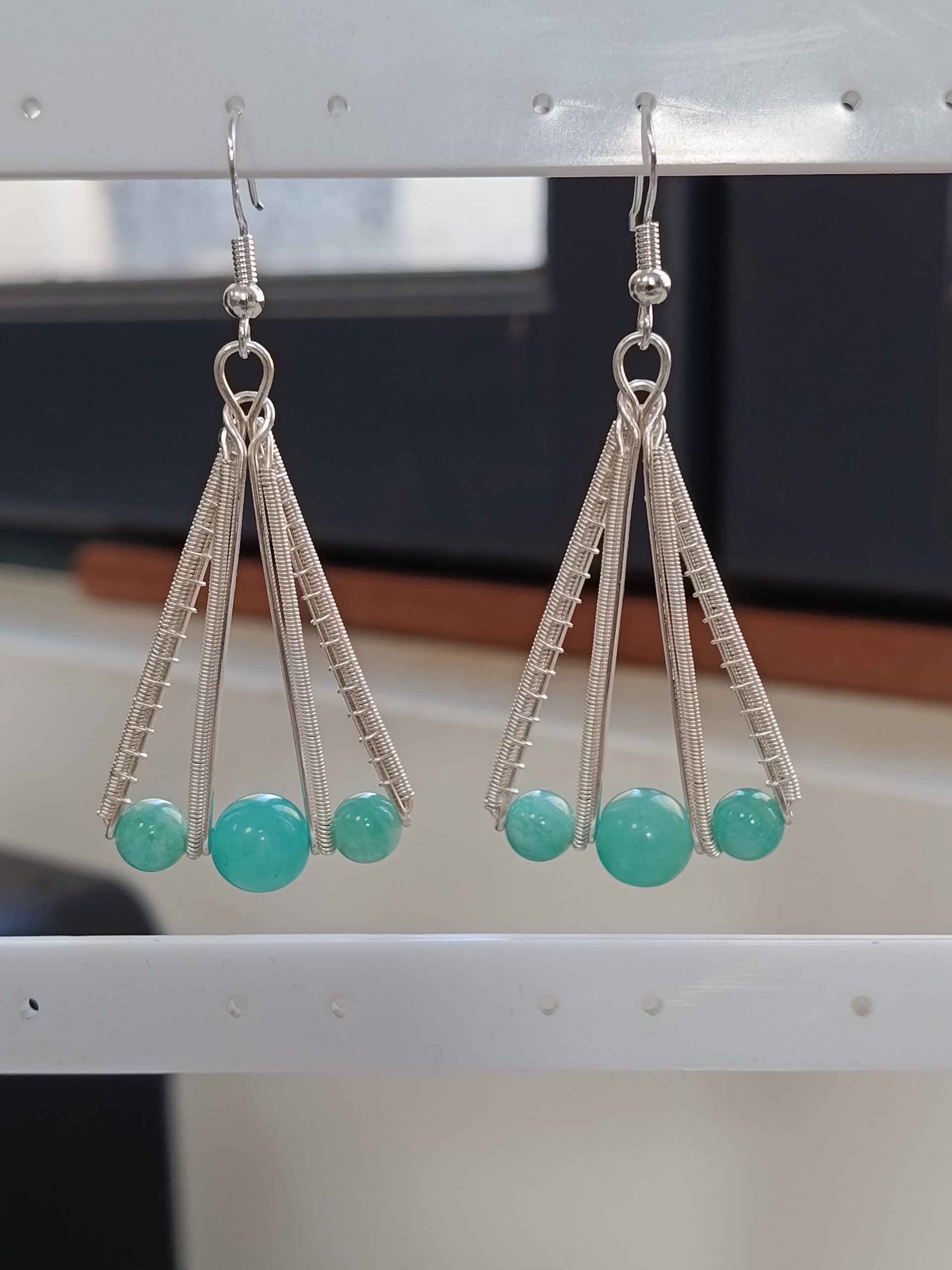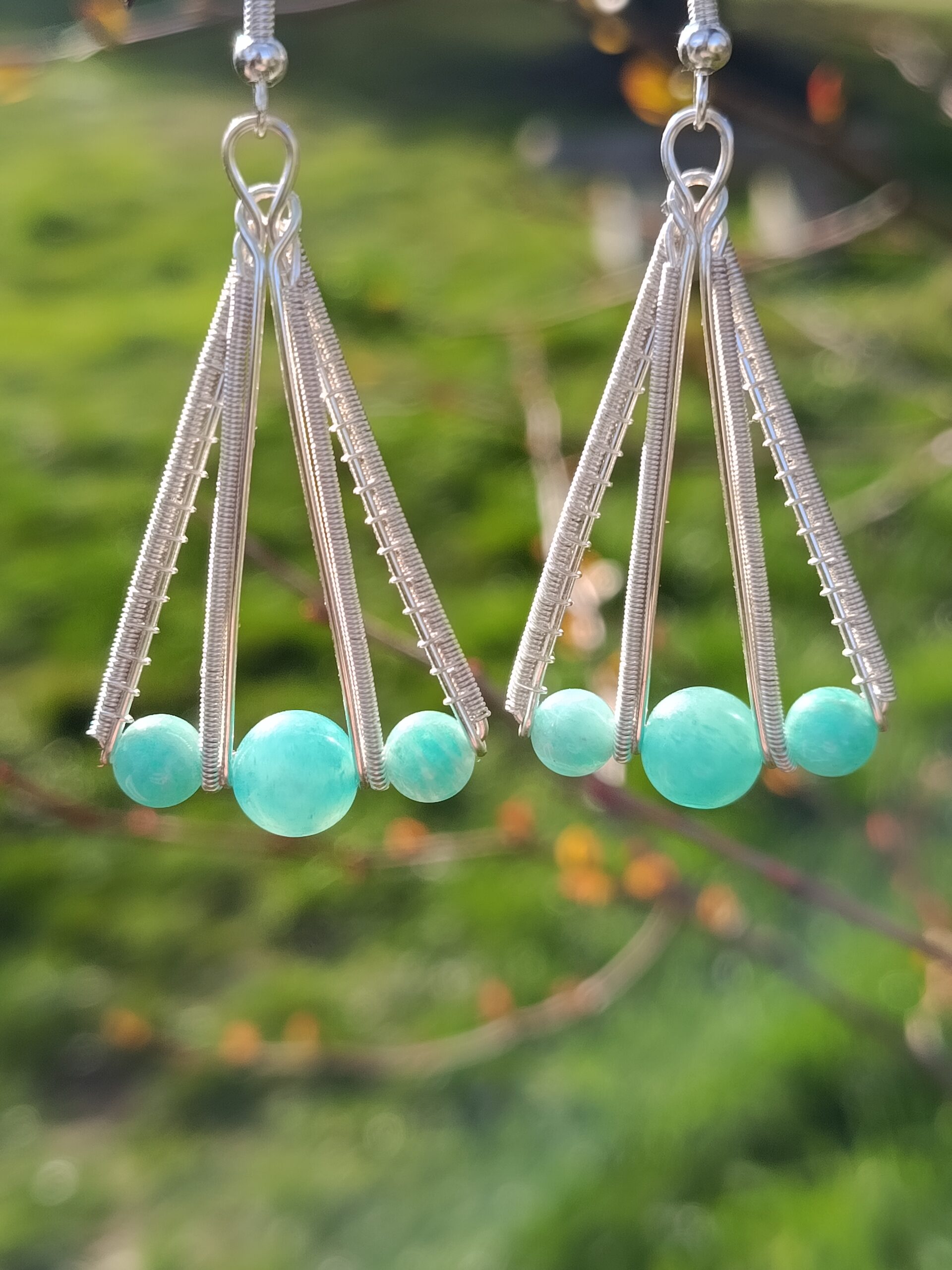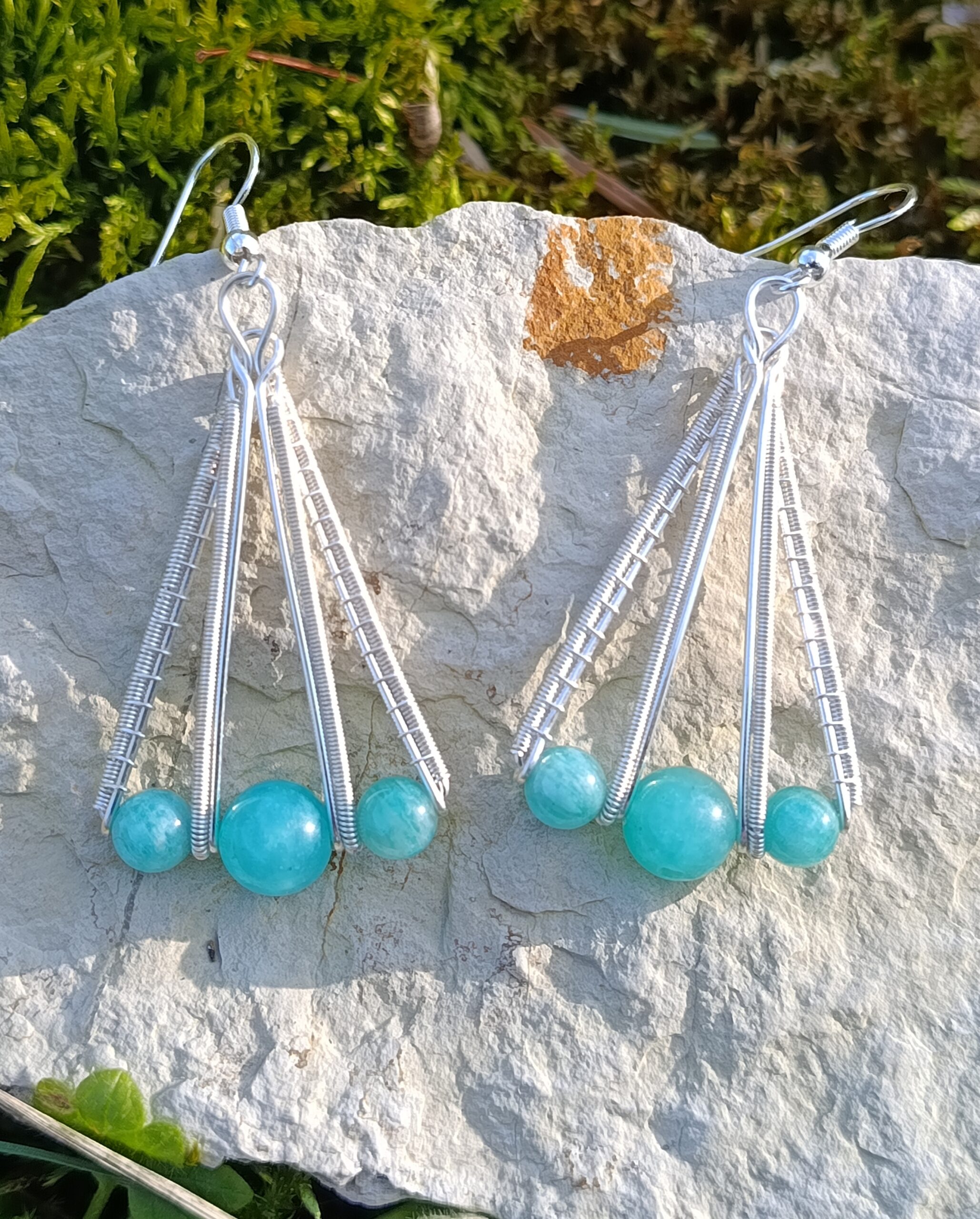 Ces très jolies perles d’amazonite de 6 et 8mm ont été serties avec du fil de cuivre plaqué argent pour créer un modèle « flottant », comme si les perles tenaient dans les airs. Réalisées à la main dans mon atelier, ces boucles sont à la fois légères, élégantes, et très originales!