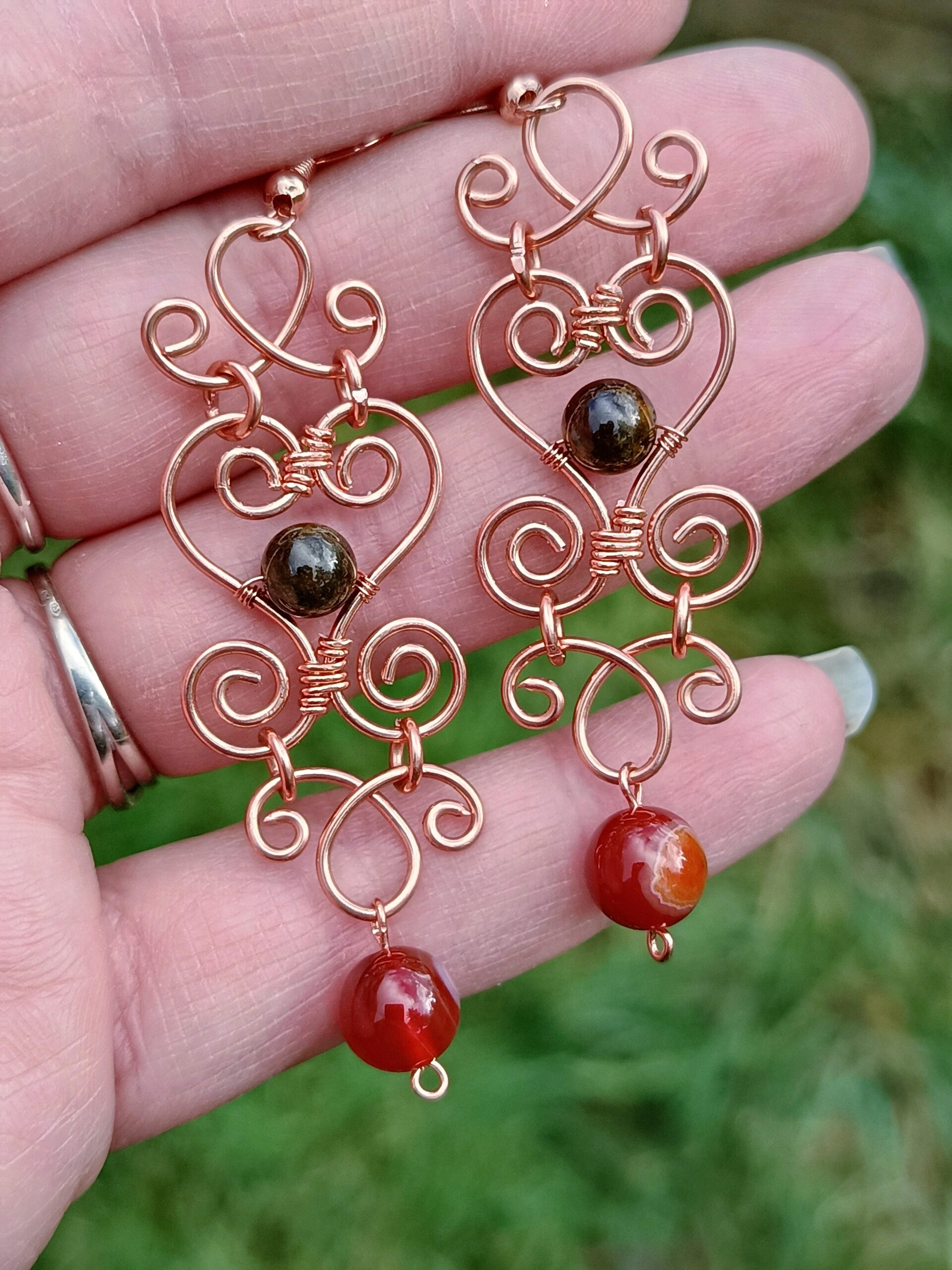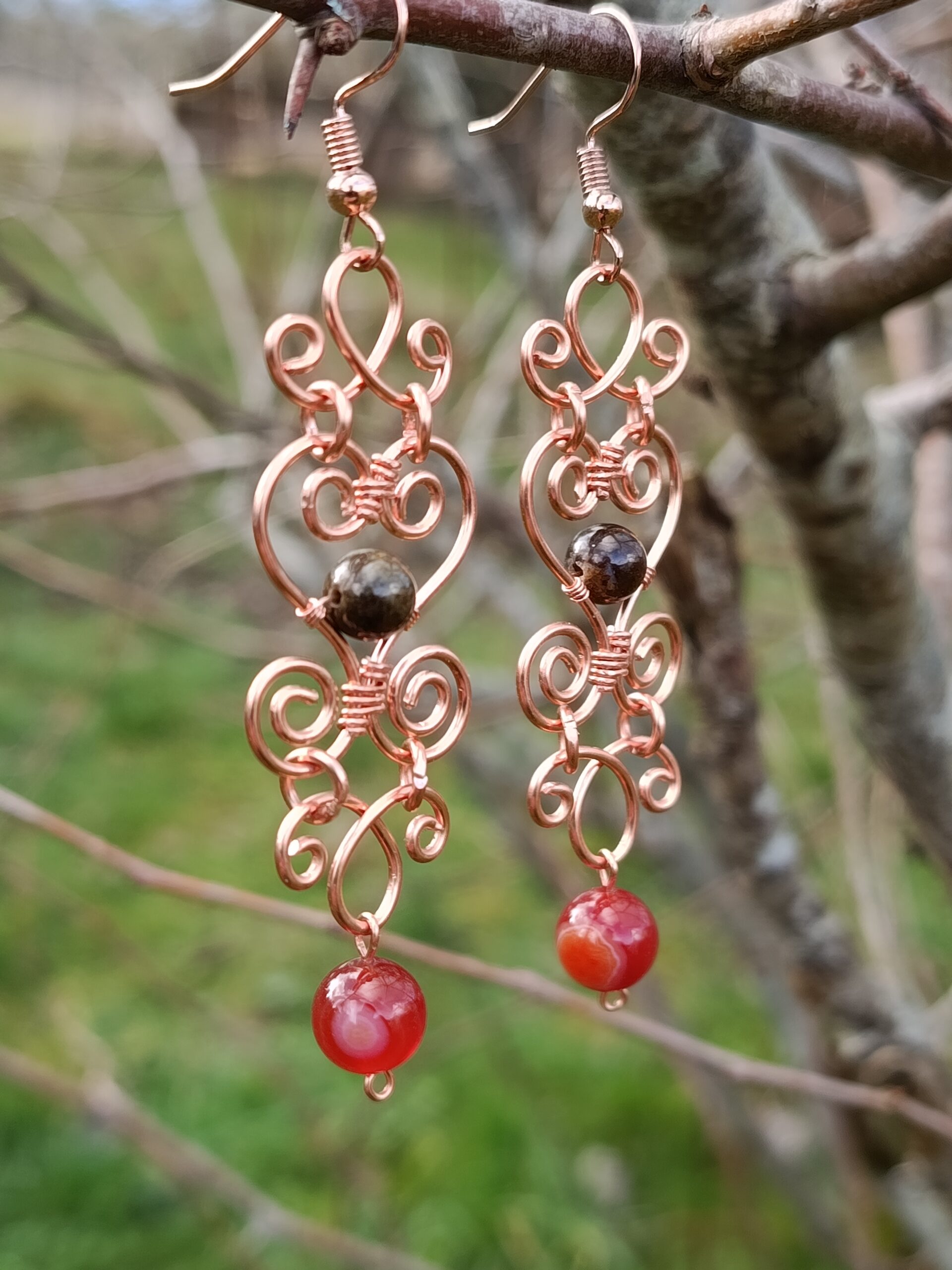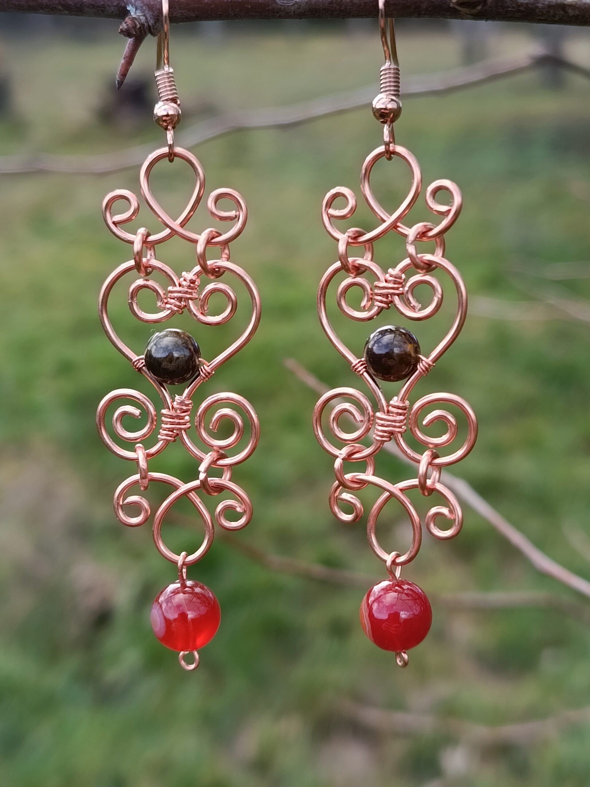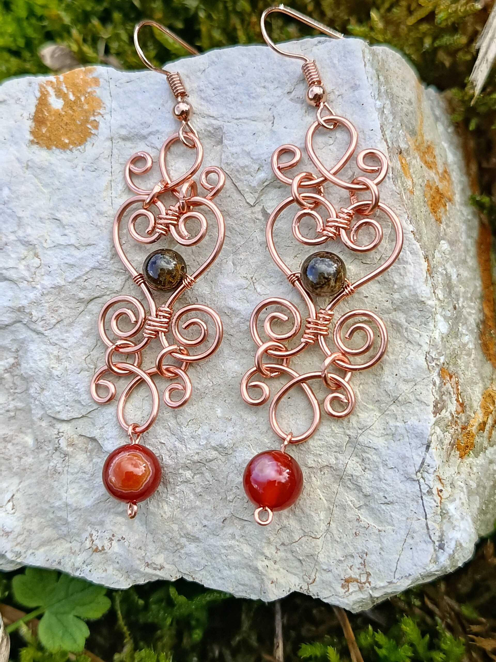 Magnifique paire de boucles d’oreilles en cuivre composée de grenat vert et de cornaline.