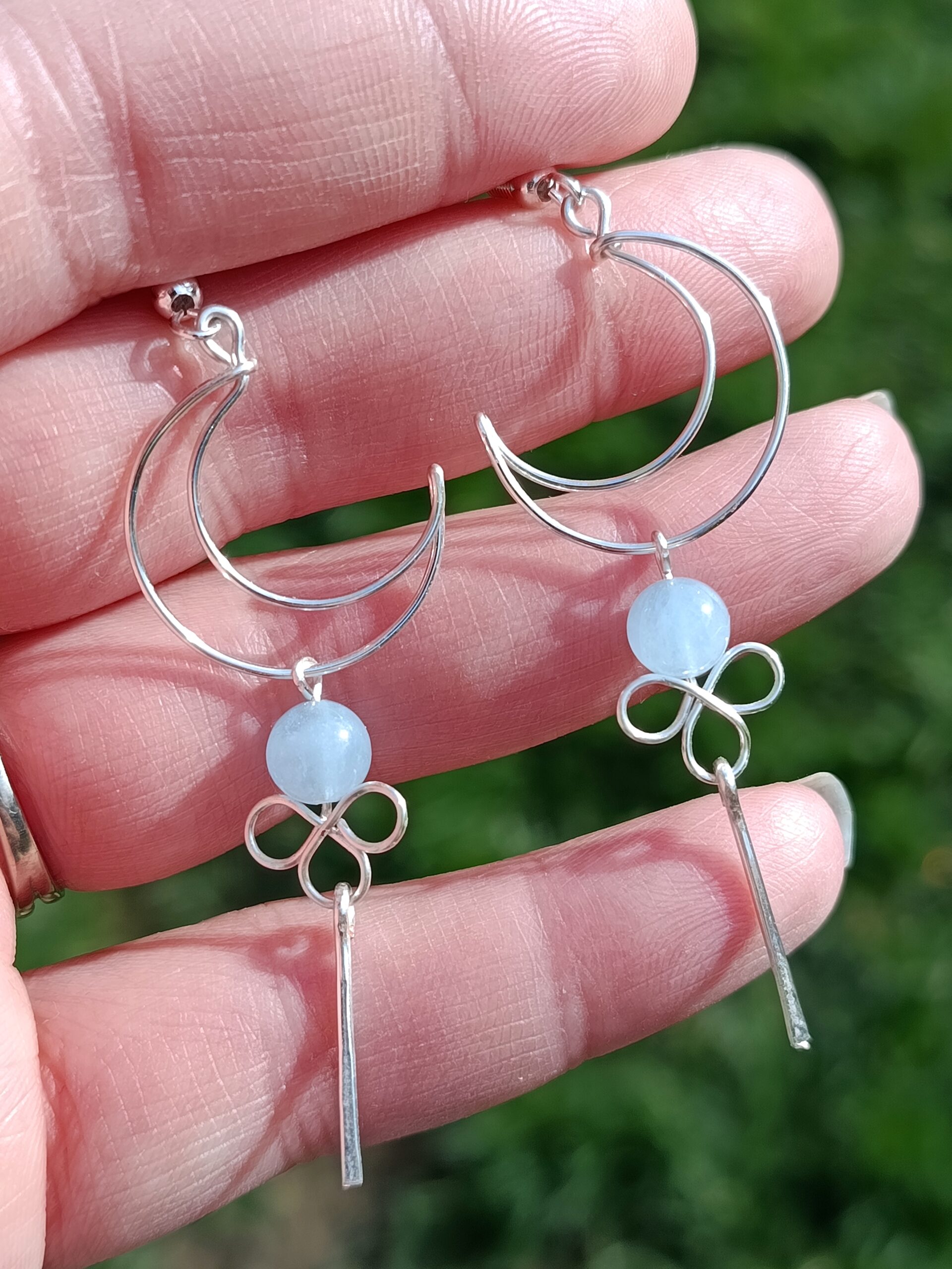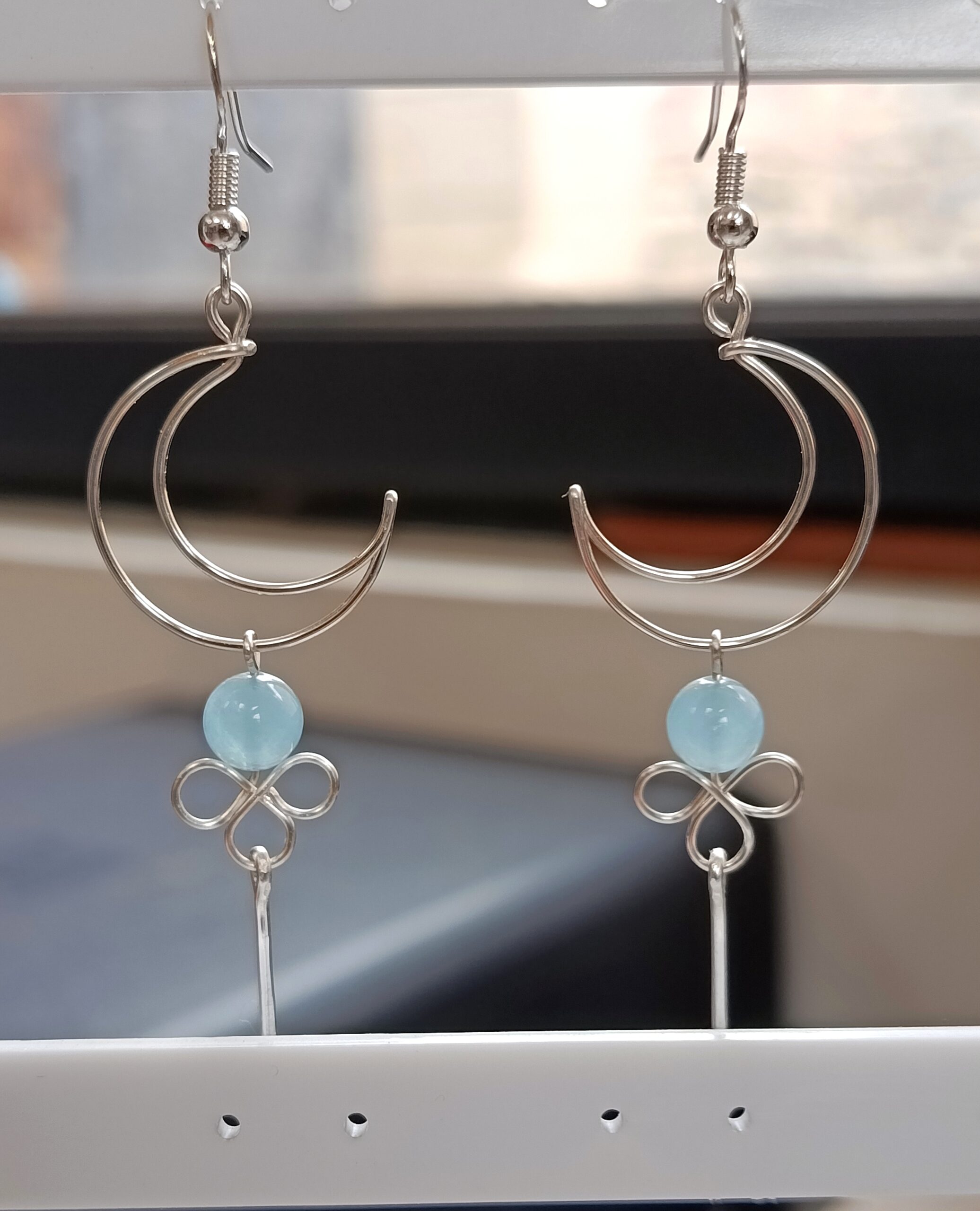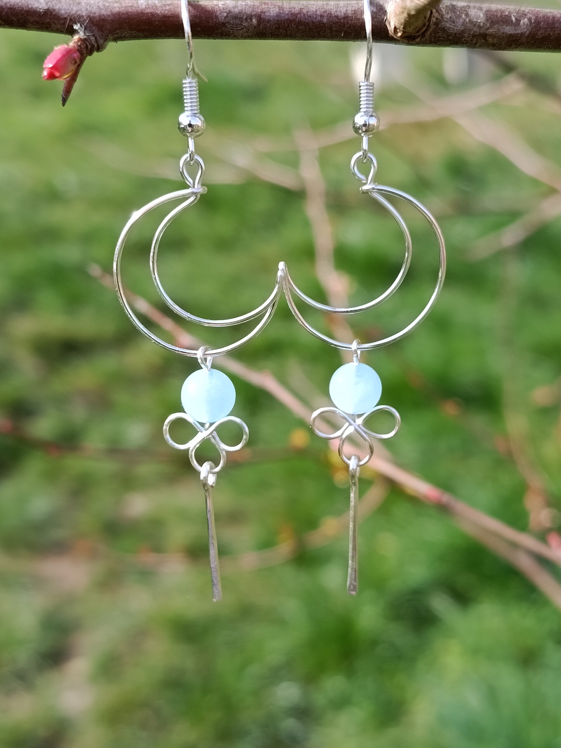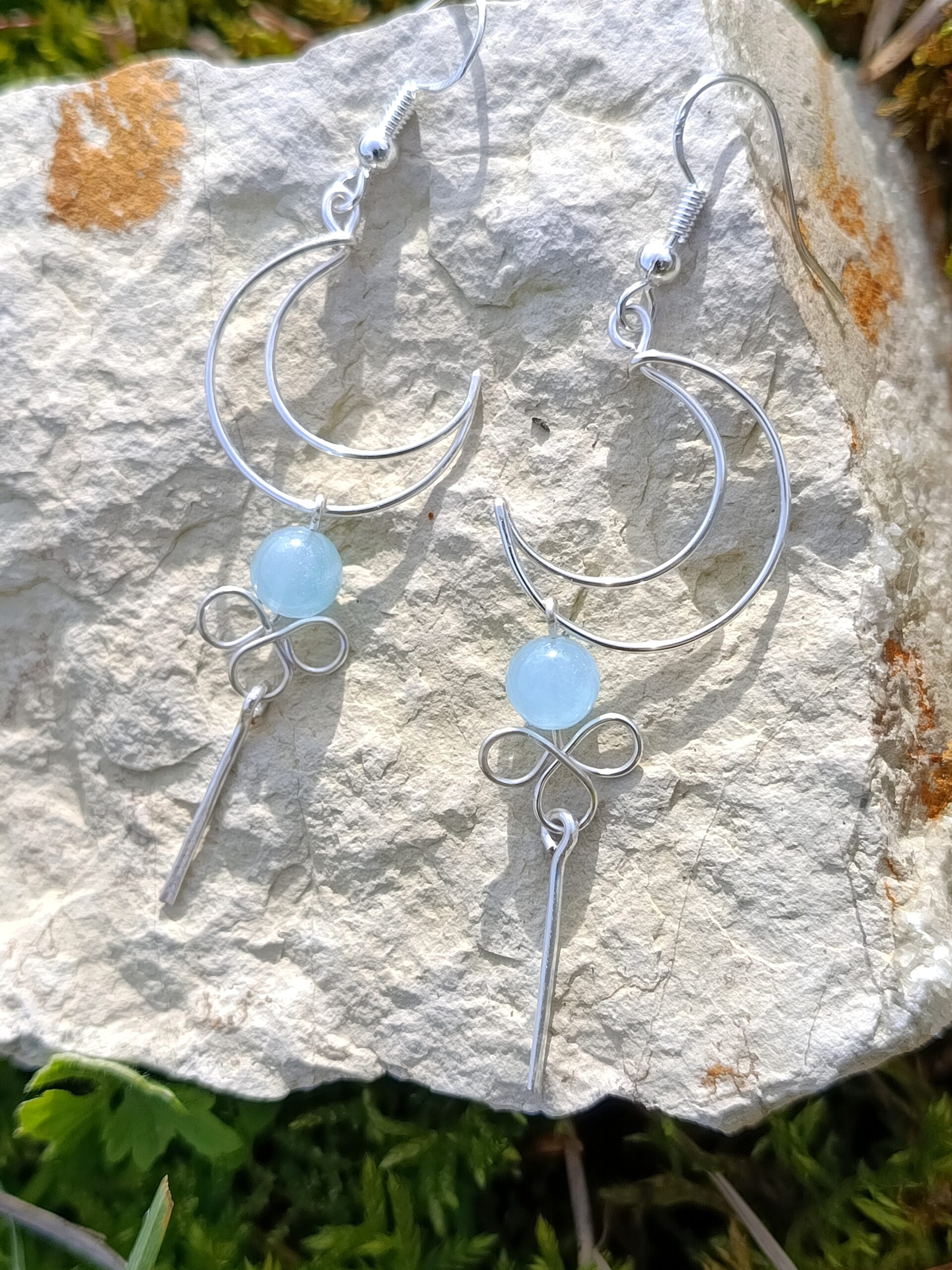 Ces jolies petites boucles d’oreilles pendantes sont d’une légèreté inouïe. Réalisés en cuivre plaqué argent à la main dans mon atelier, ces beaux croissants de lune sont accompagnés de deux perles de 6mm en aigue marine au bleu ciel intense et délicat. A la fois poétique et enchanteresse, ces boucles d’oreilles apporteront une touche de douceur à votre tenue.