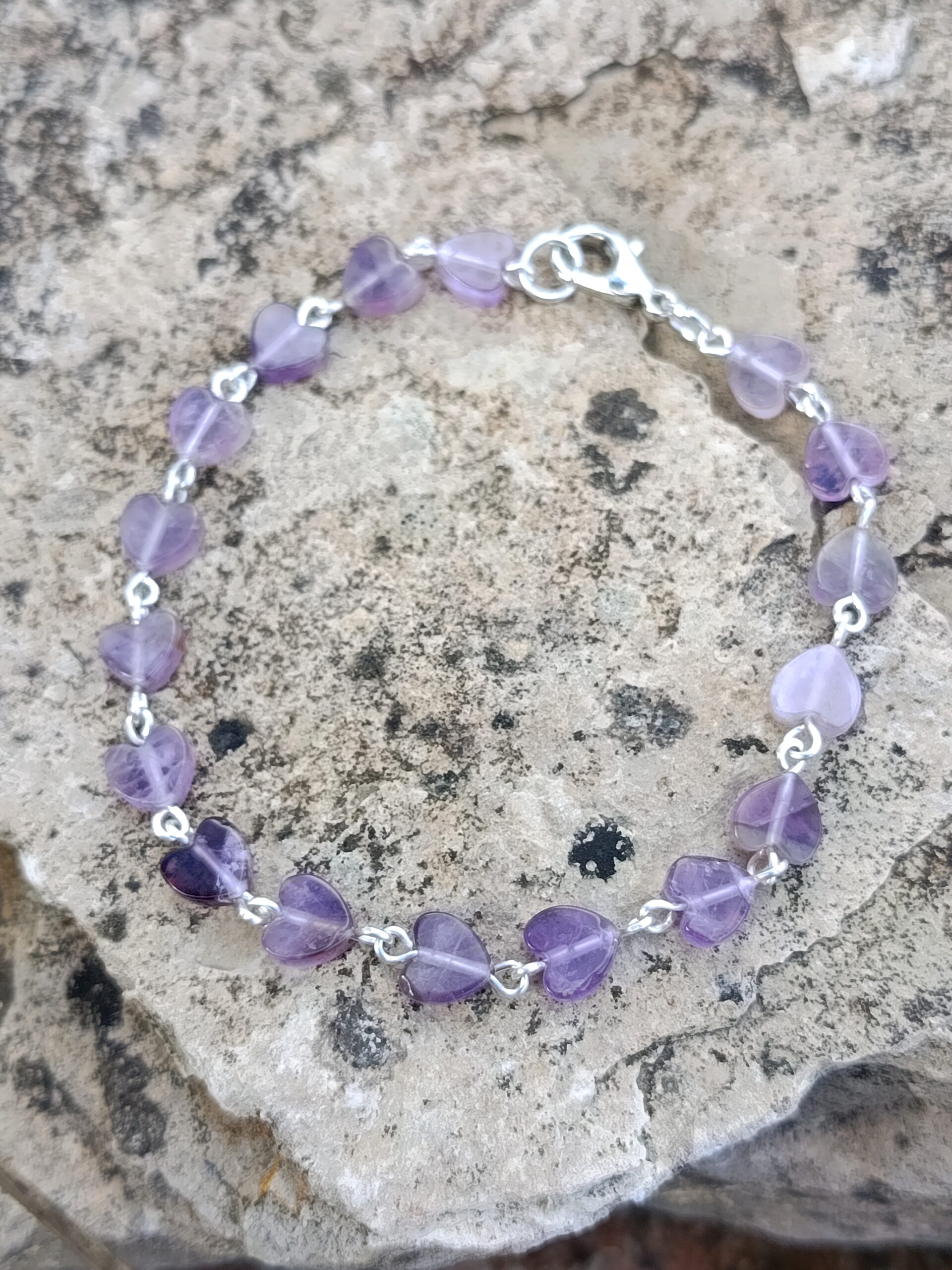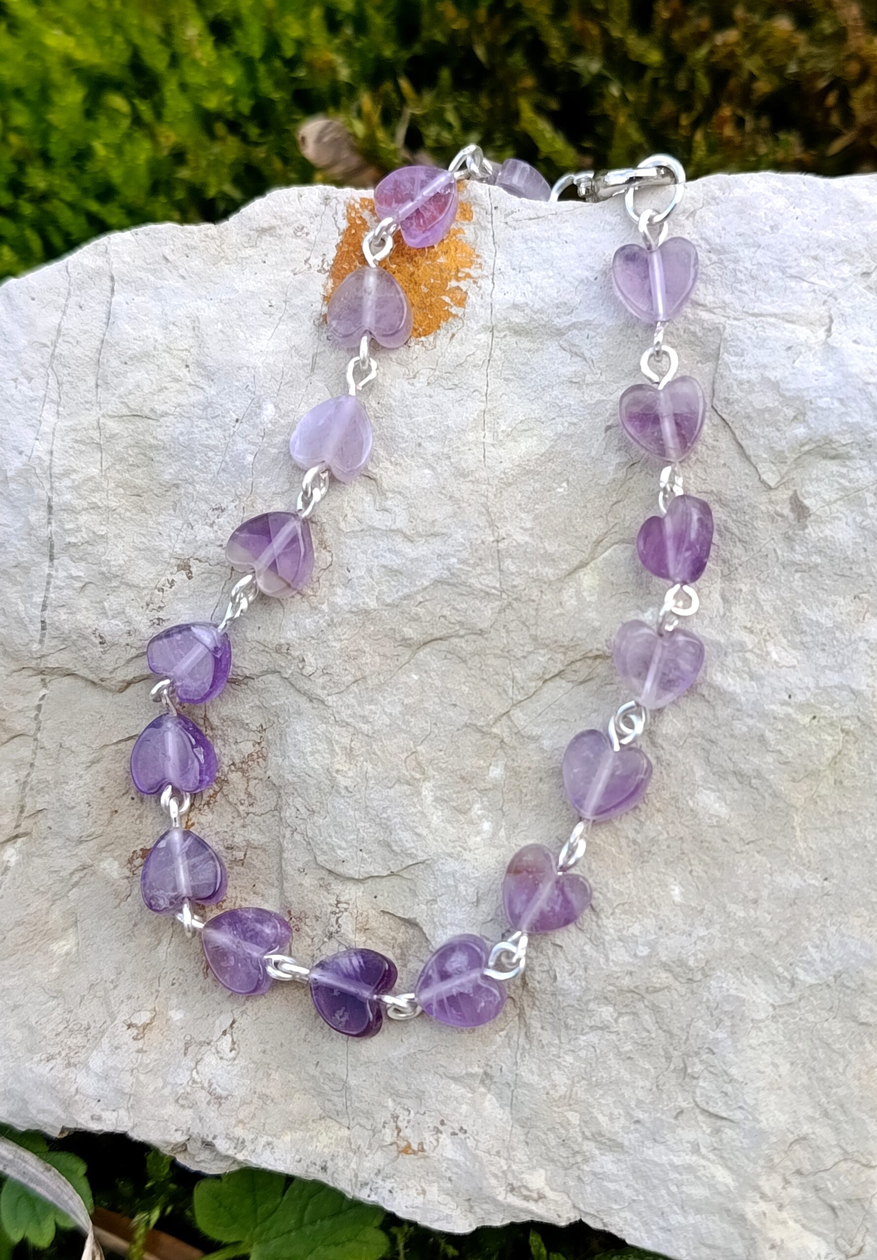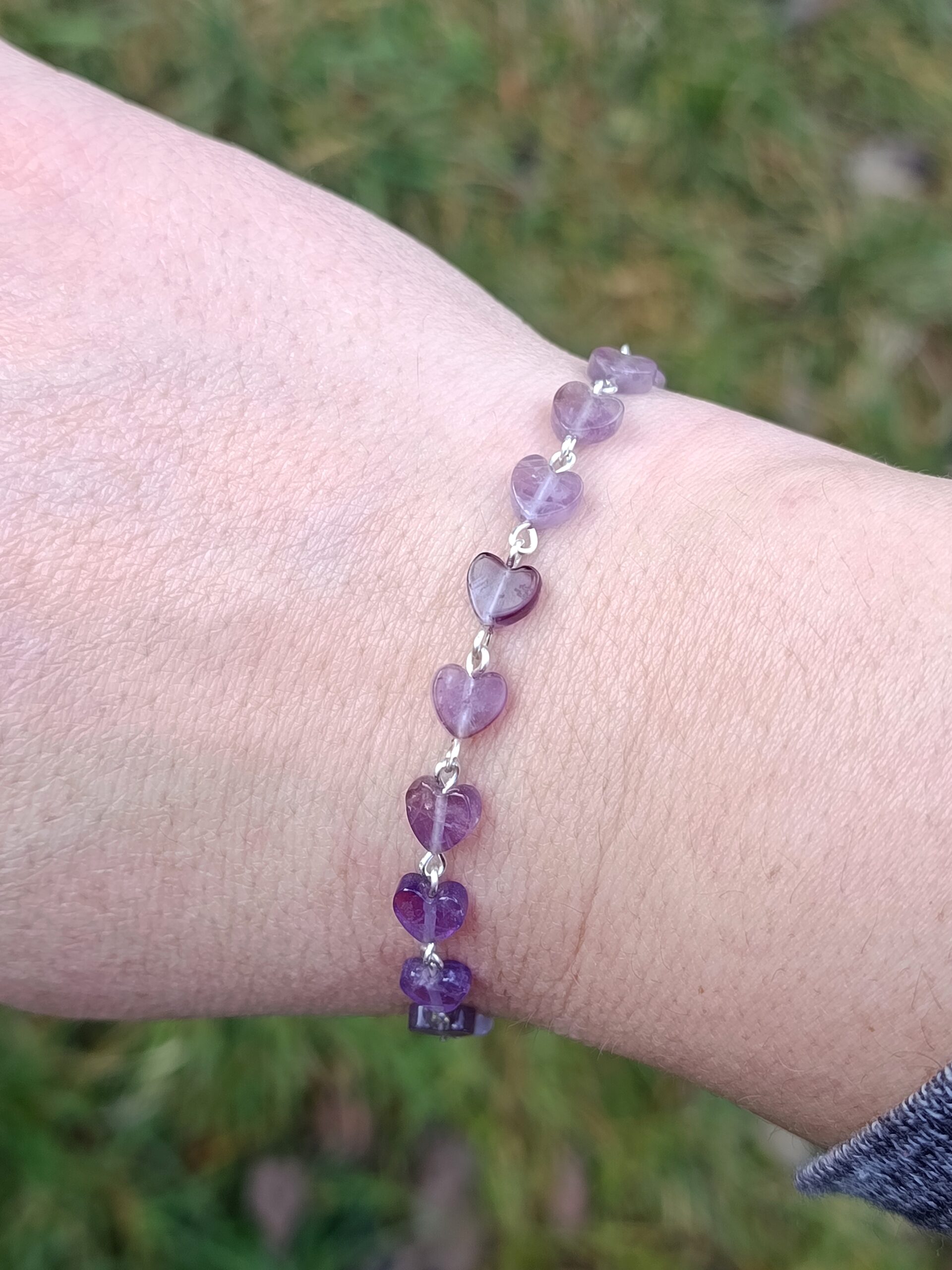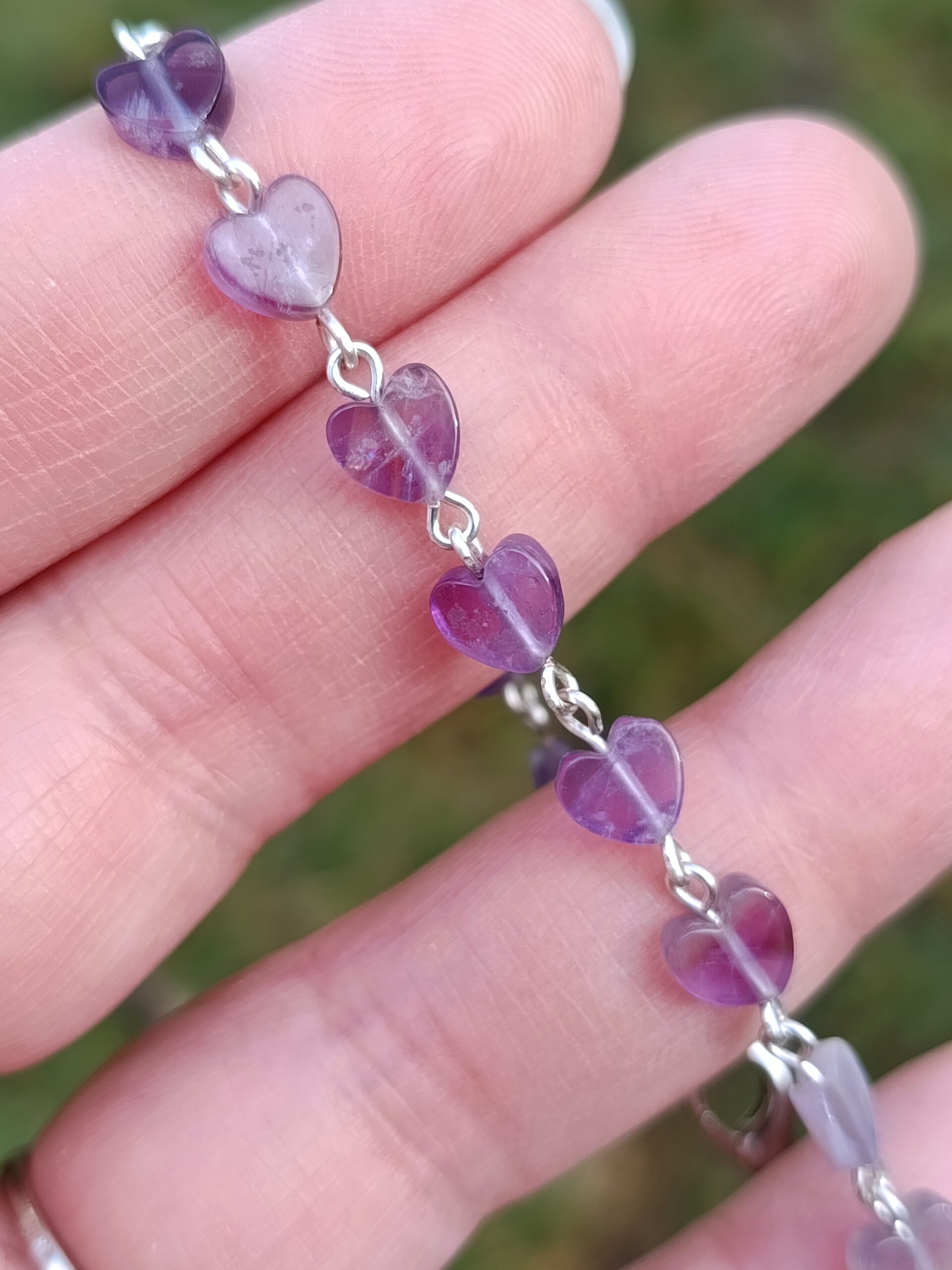 Ces magnifiques perles d’améthyste en 6mm ont la particularité d’être en forme de coeurs : ultra girly et poétique, elles couvrent une large palette de violet, pour un rendu tout à fait unique et original. Pour un rendu à la fois élégant et hyper agréable à porter grâce à sa fluidité, chaque perle a été montée une à une avec du fil de cuivre plaqué argent pour former ce très joli bracelet « chaîne »!
