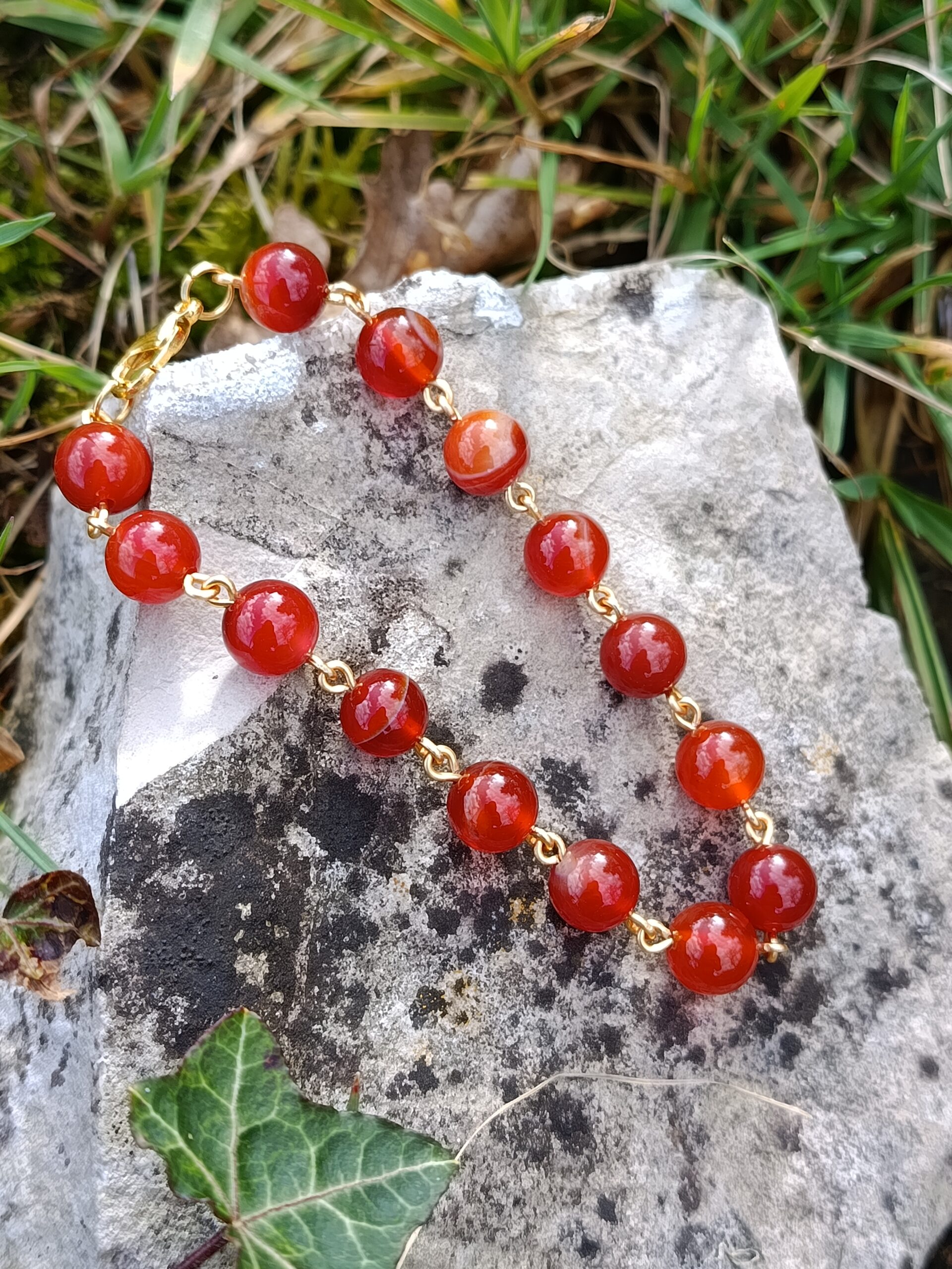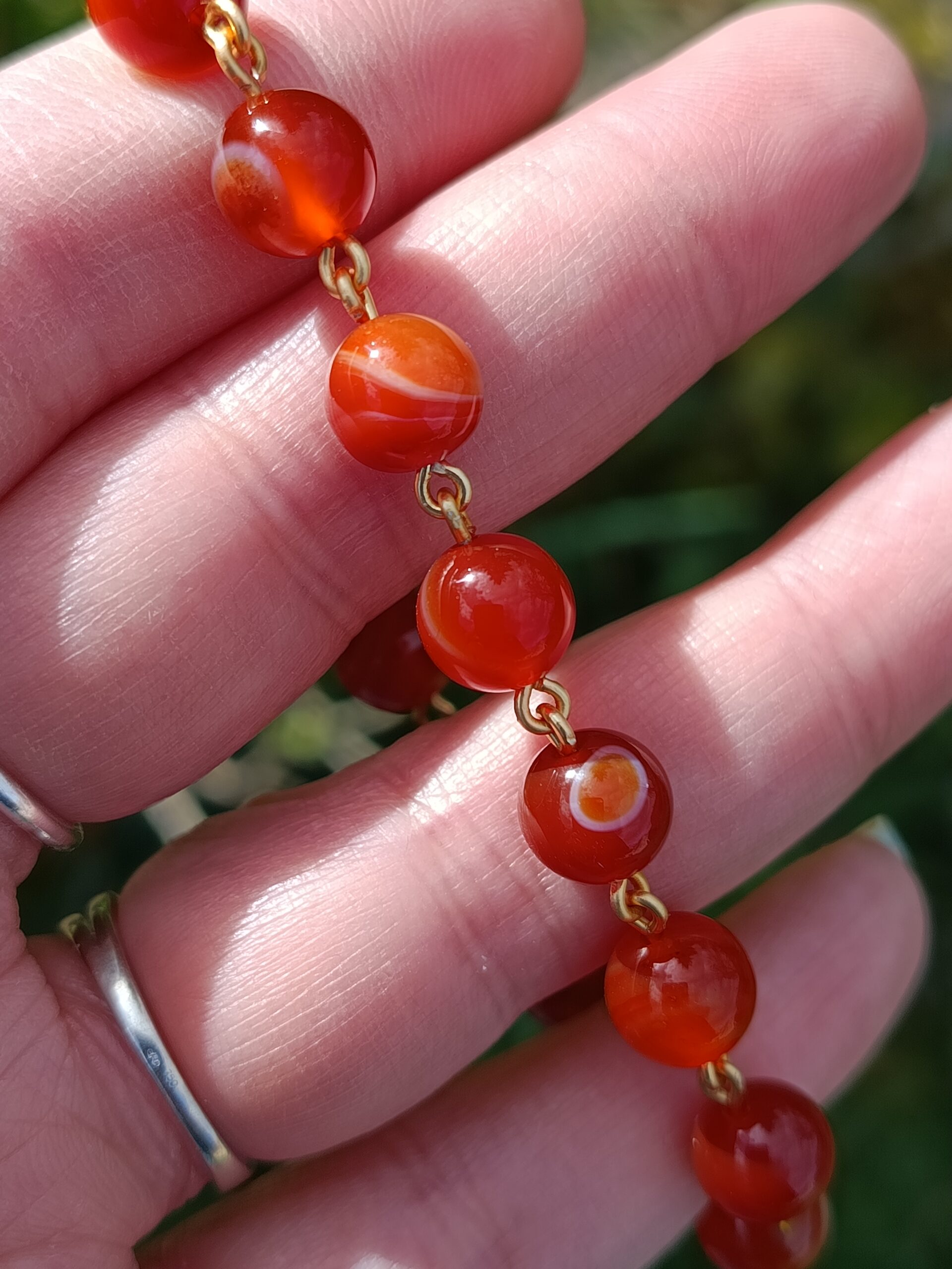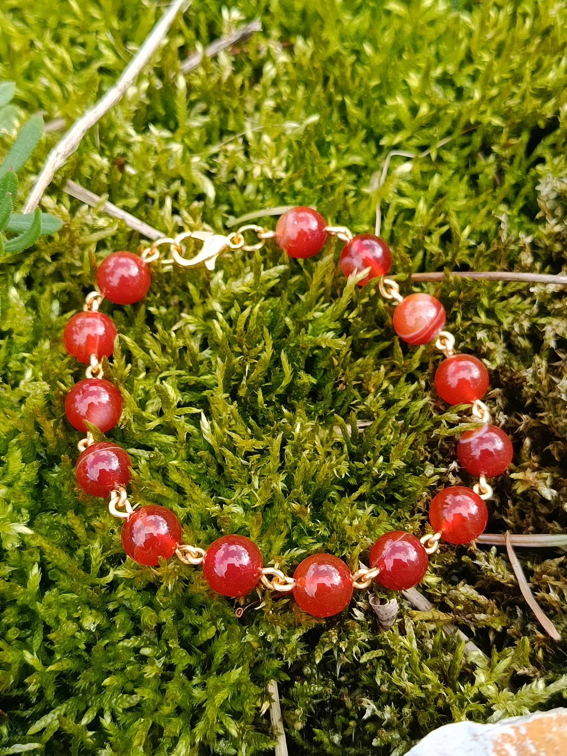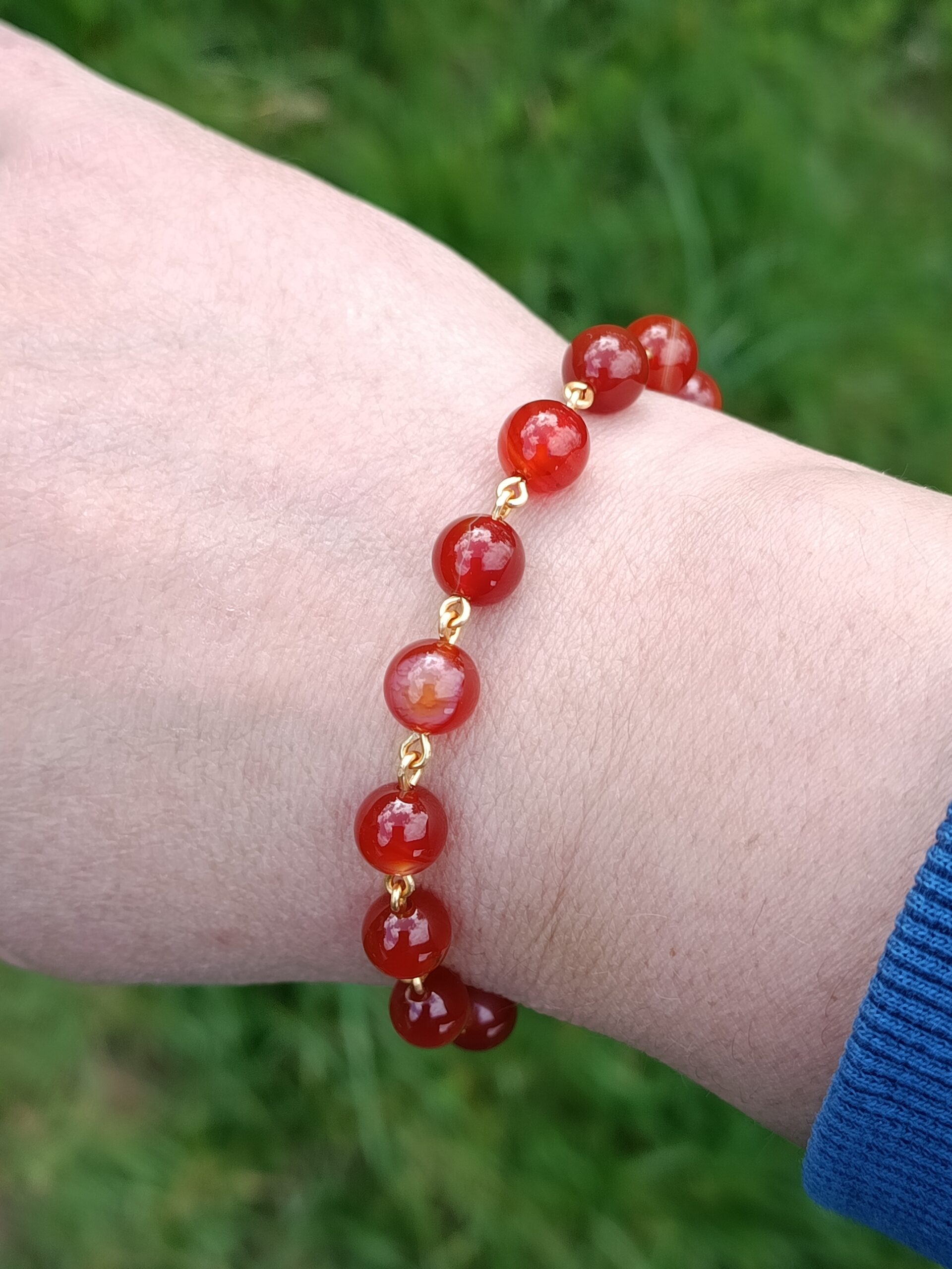 Très joli bracelet façon chaîne composé de 14 perles de cornaline montées sur fil de cuivre doré.
