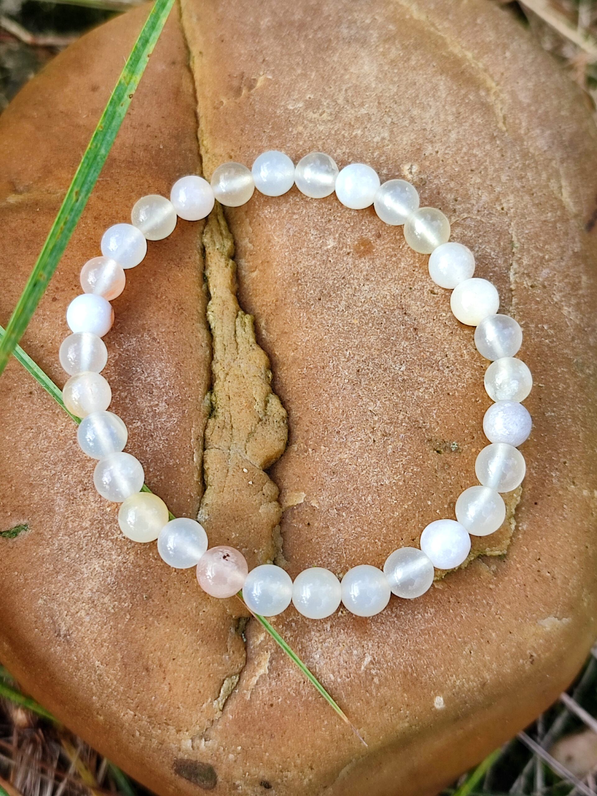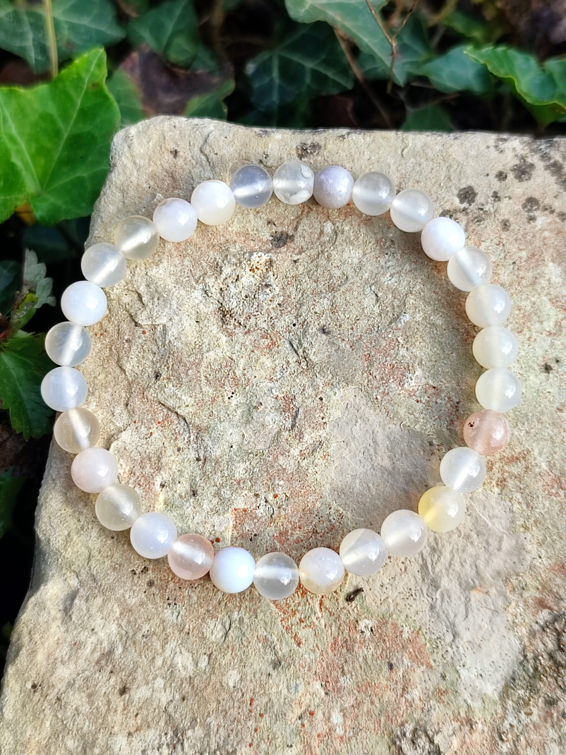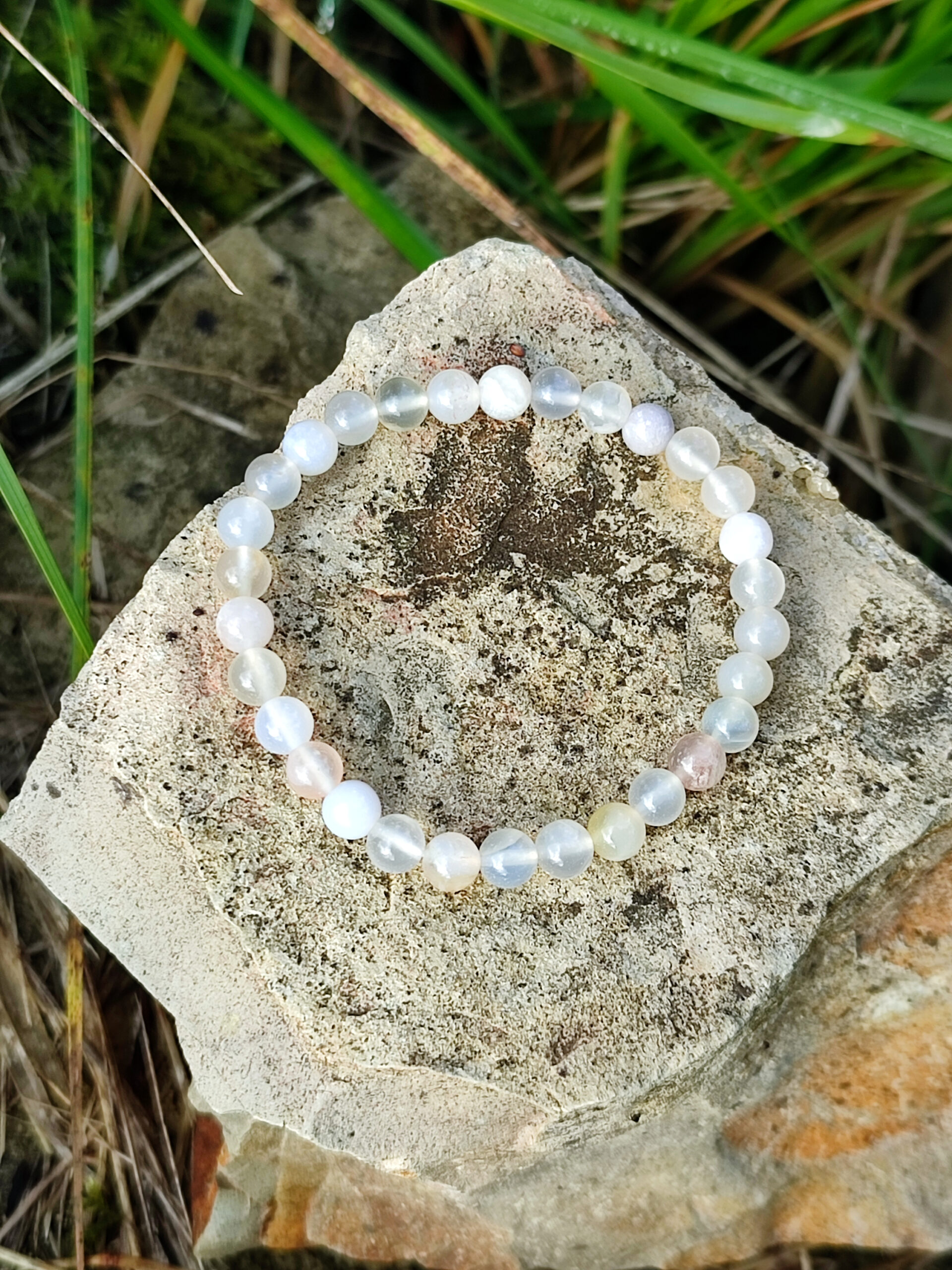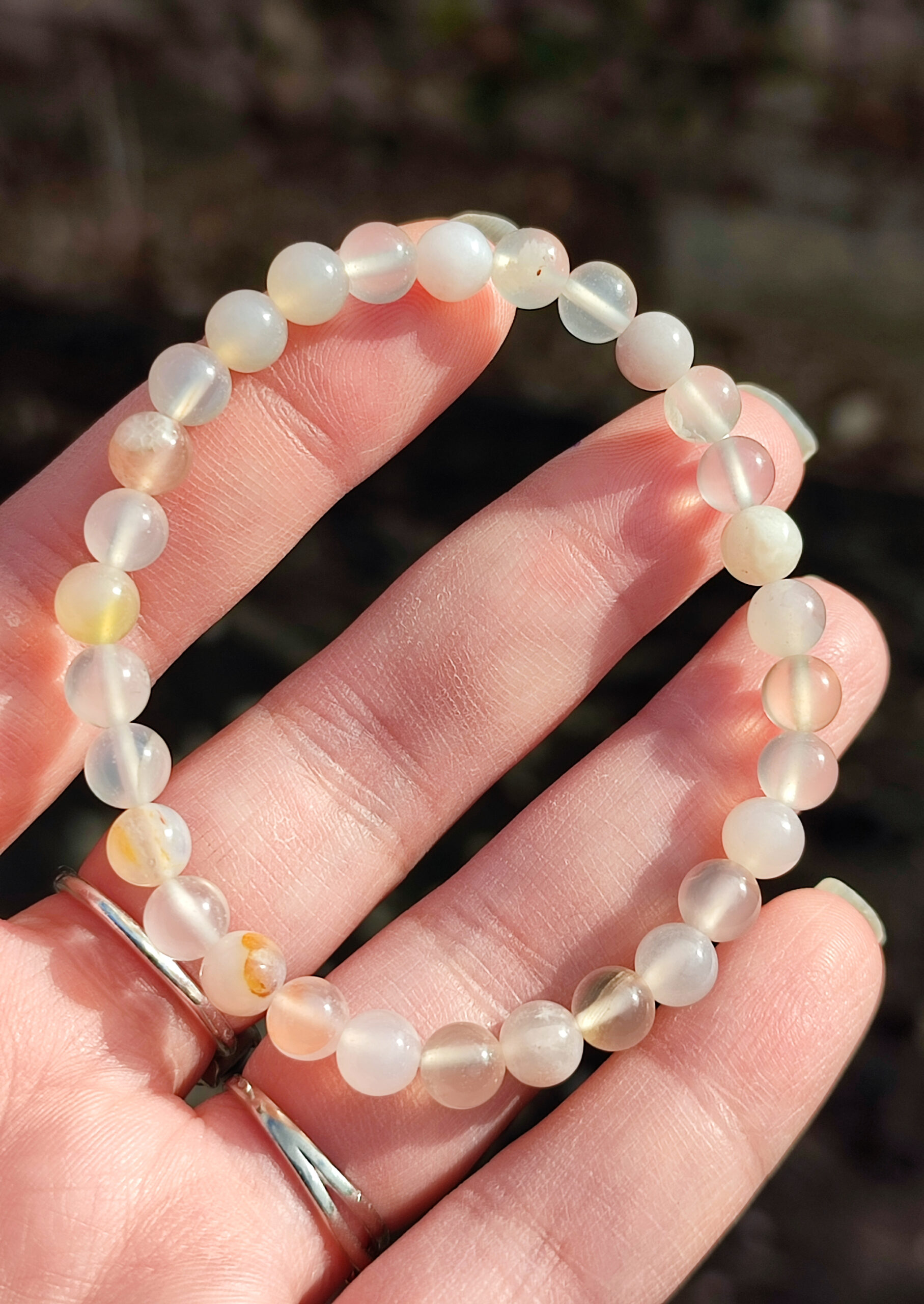 Ces jolies perles d’agate fleurs de cerisier de 6mm offrent un joli mélange de couleur variant du blanc rosé au gris, en passant par l’abricot. Délicates et légères, ce beau bracelet aux notes très douces sera parfait à porter tous les jours !