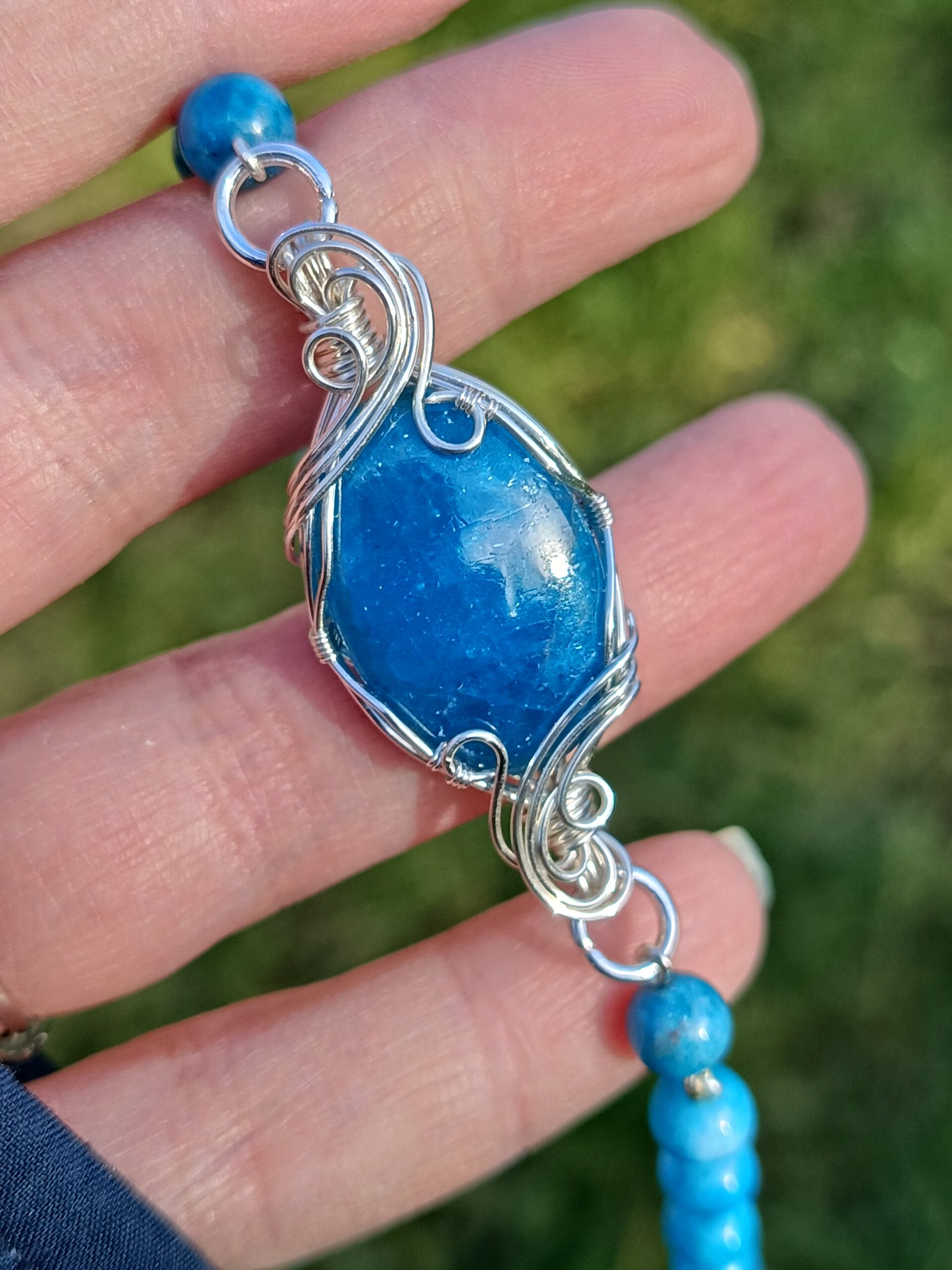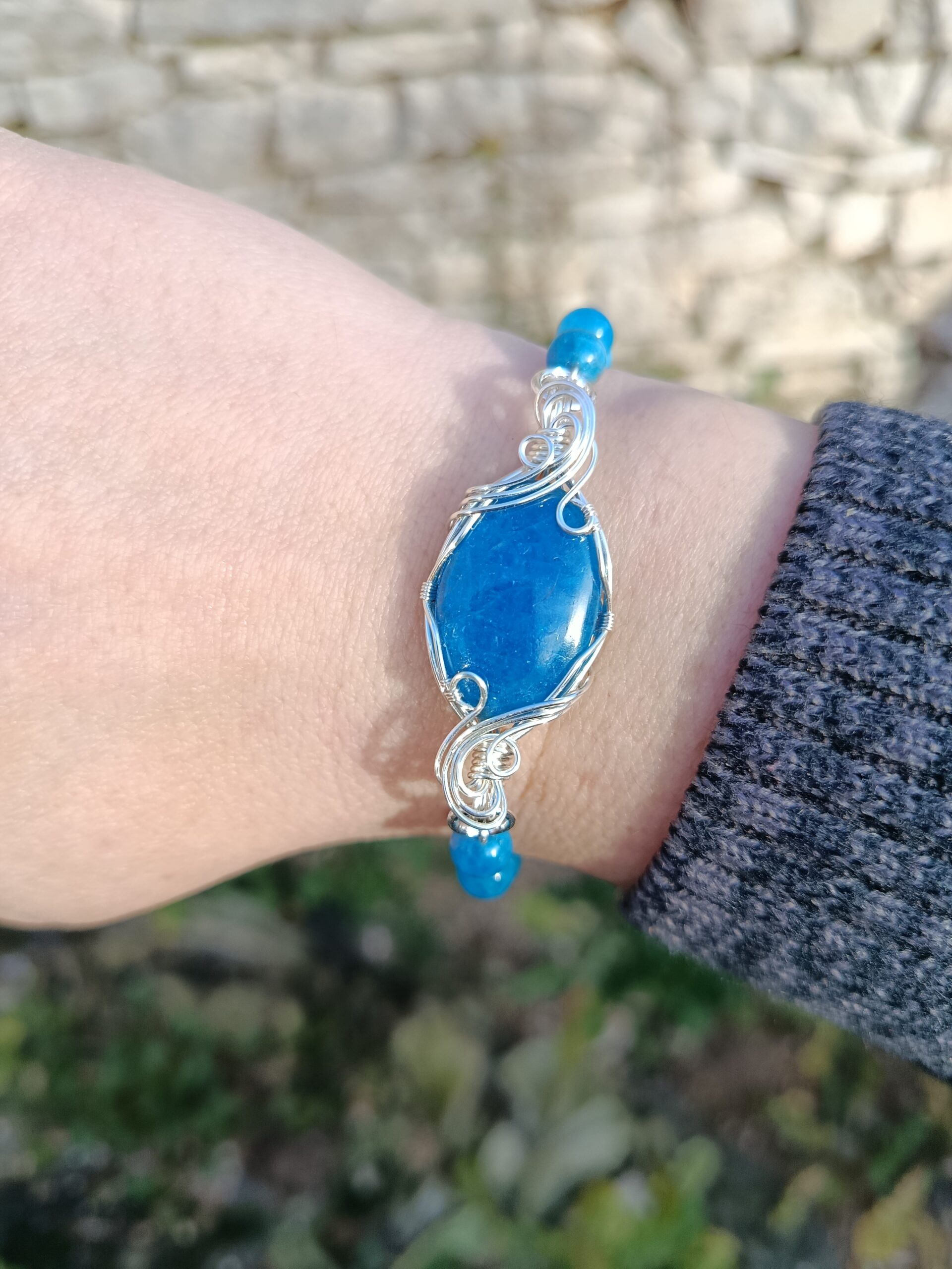 Ce magnifique cabochon d’apatite bleue possède une couleur réellement intense, typique des cabochons de grande qualité. Serti en cuivre plaqué argent de façon voluptueuse et élégante, il est accompagné de 10 perles d’apatite de qualité extra en 6mm, d’un bleu tout aussi soutenu que la pierre, montées une à une en chaîne. A la fois fluide et léger, ce bracelet totalement unique et originale est très agréable à porter.