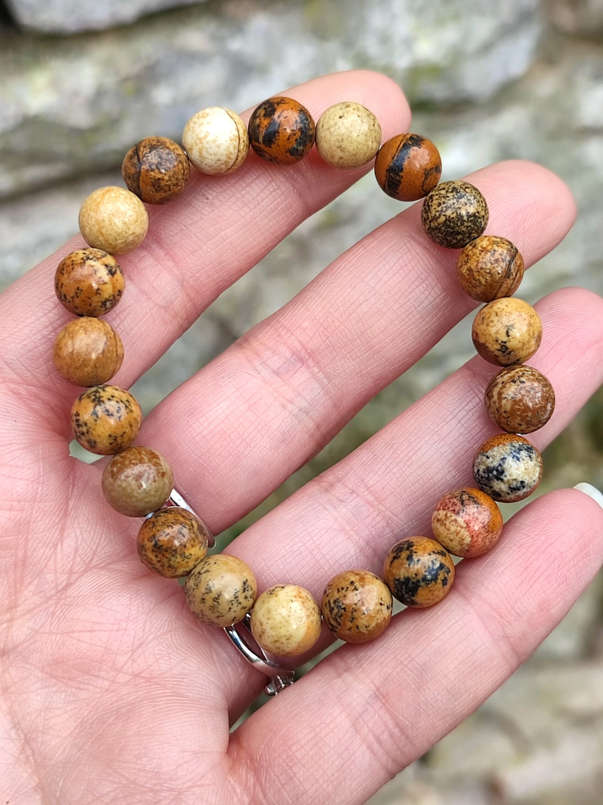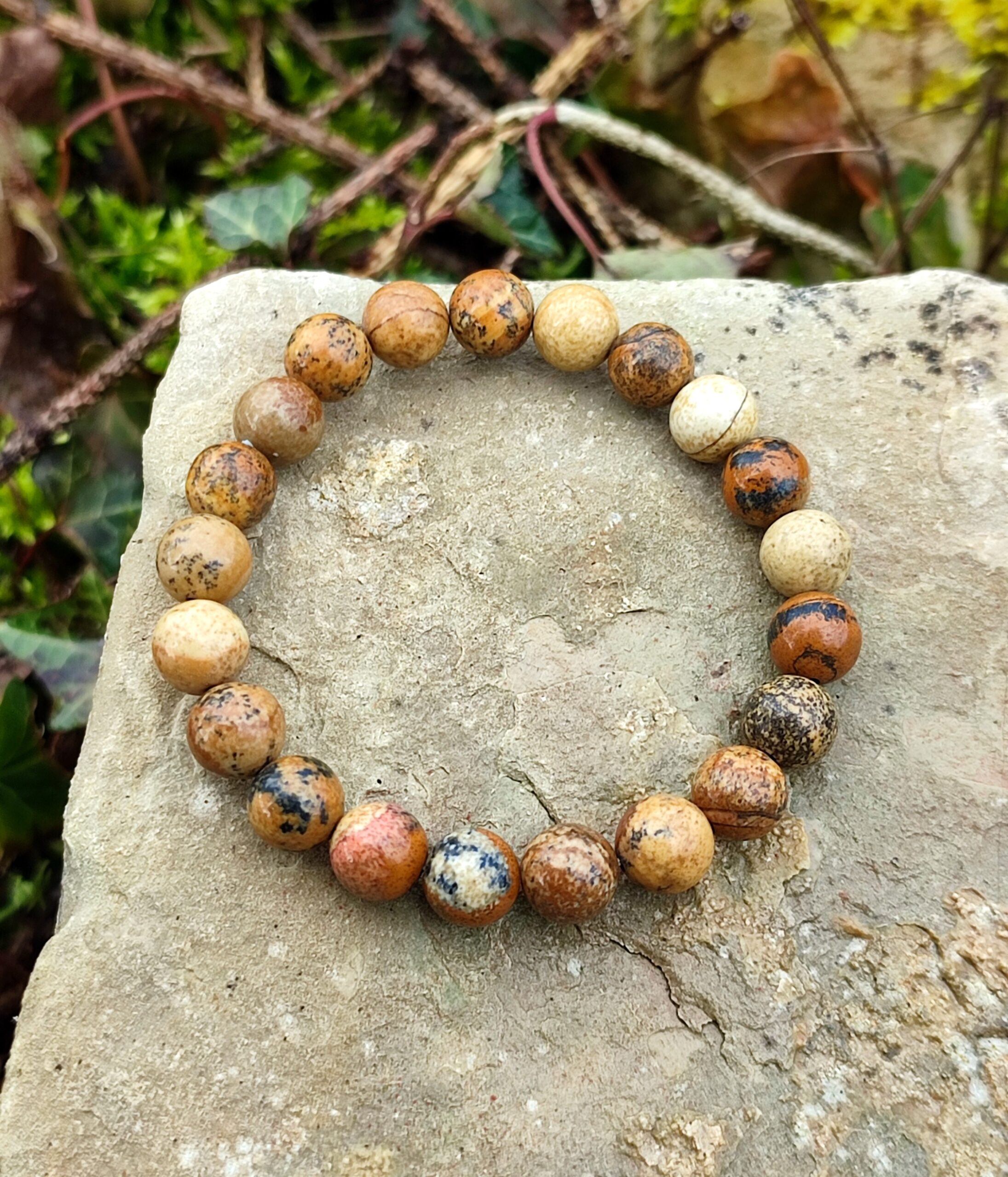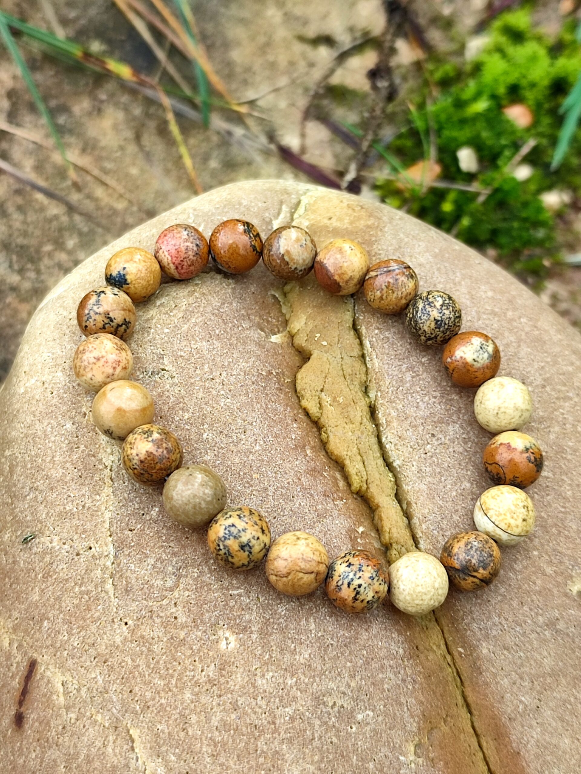 Ces très belles perles de jaspe paysage de 8,5mm sont d’une superbe qualité : de très belles nuances sables et brunes, mêlées à de belles inclusions de dendrites noires qui offrent de très beaux contrastes. Chaque perle est différente l’une de l’autre, le tout pour un bracelet unique !