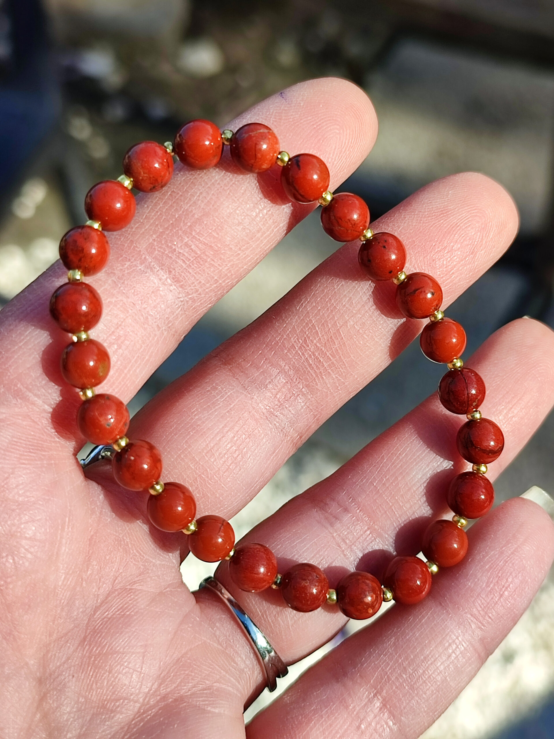 Bracelet en jaspe rouge et perles de rocailles dorées