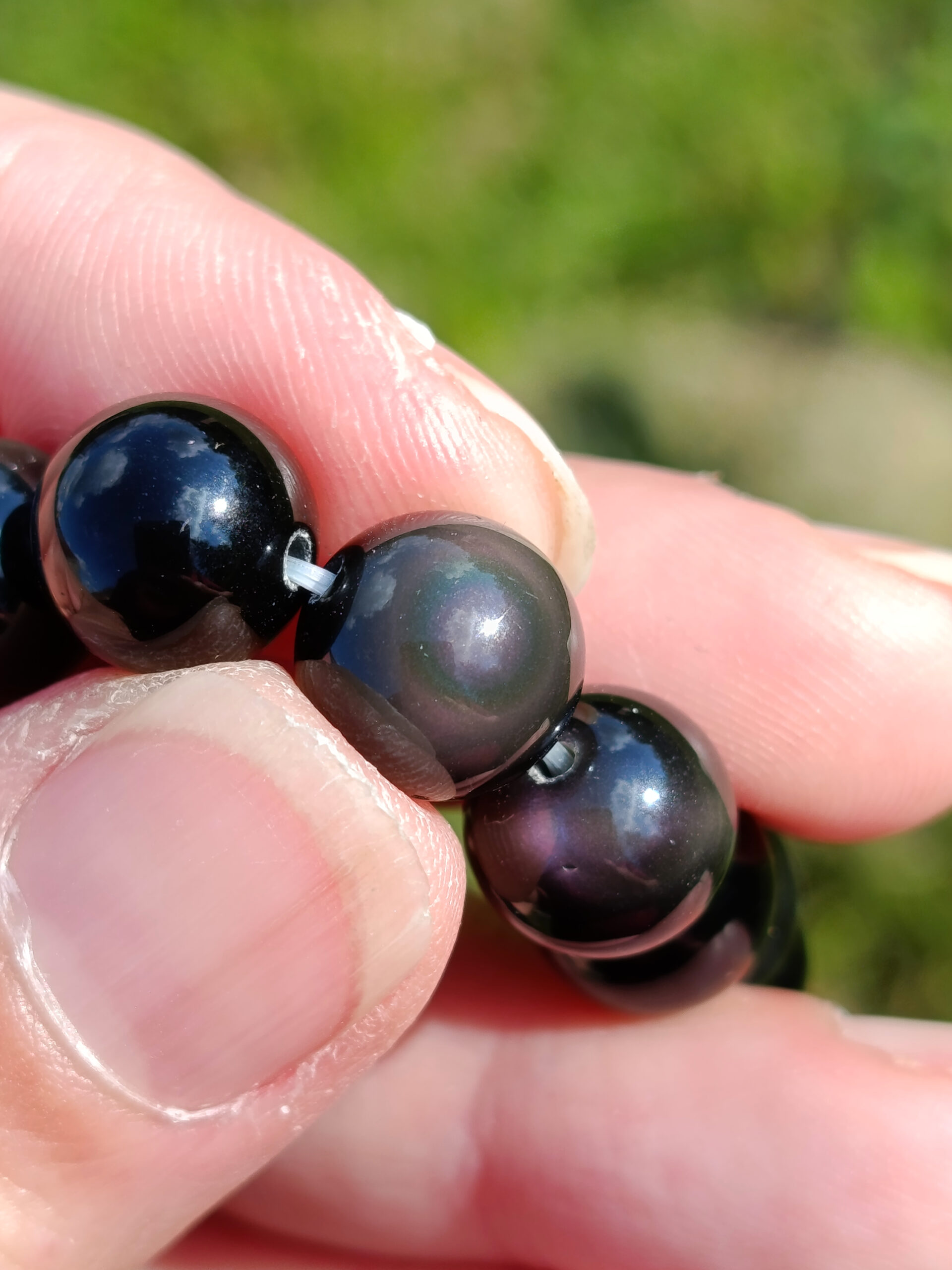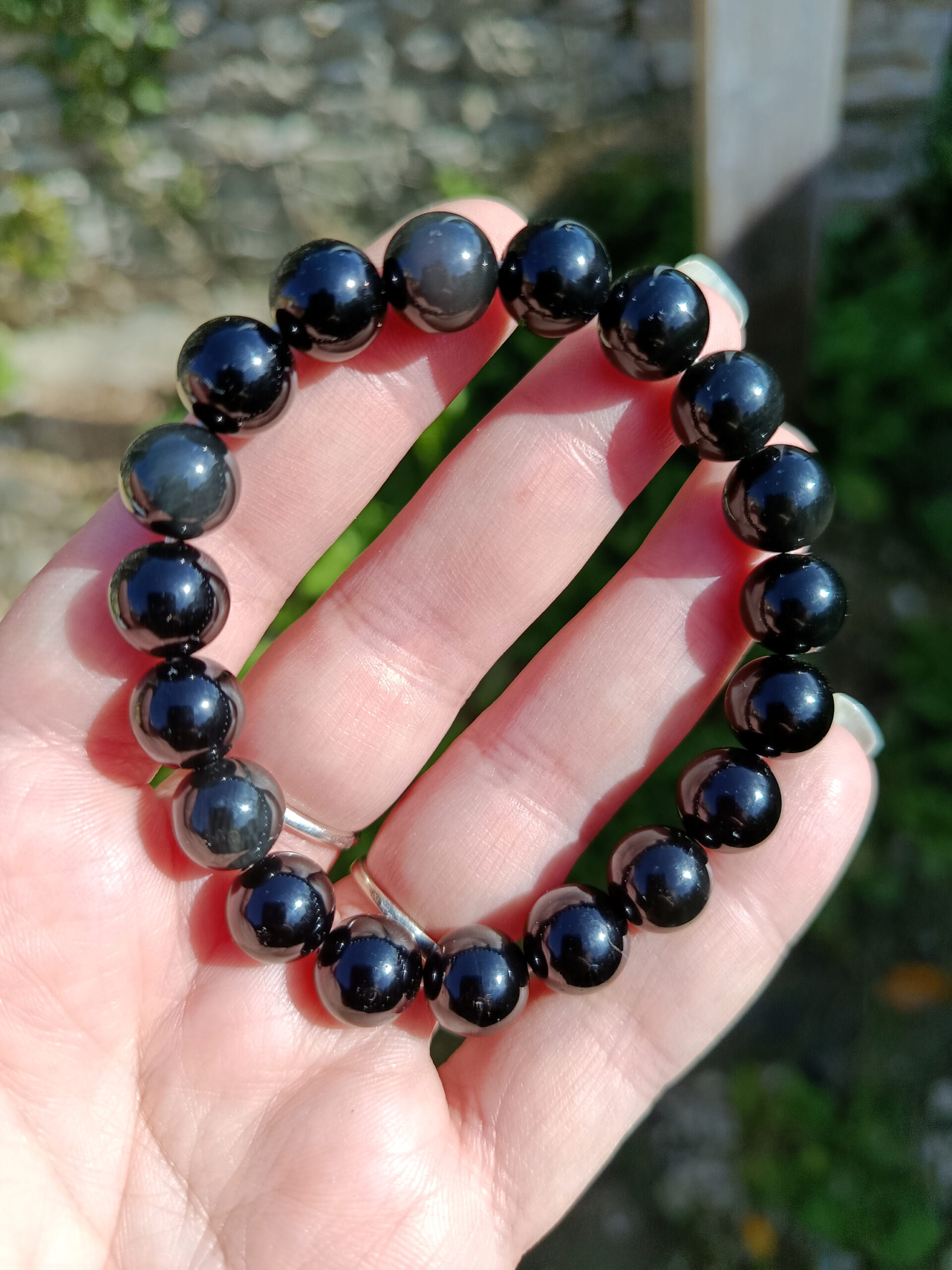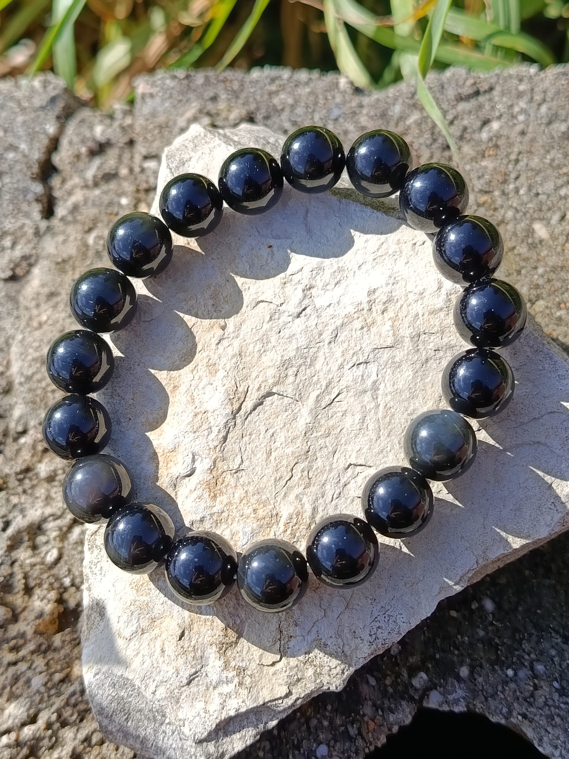 Ces jolies perles de 10mm d’obsidienne offrent de jolis reflets discrets pour certains et bien présents pour d’autres: on peut apercevoir quelques reflets « oeil », mais également de jolis effets « velours ». Leur couleur, d’un noir profond et très brillant, en fait un bracelet d’une belle élégance à porter pour toutes les occasions !