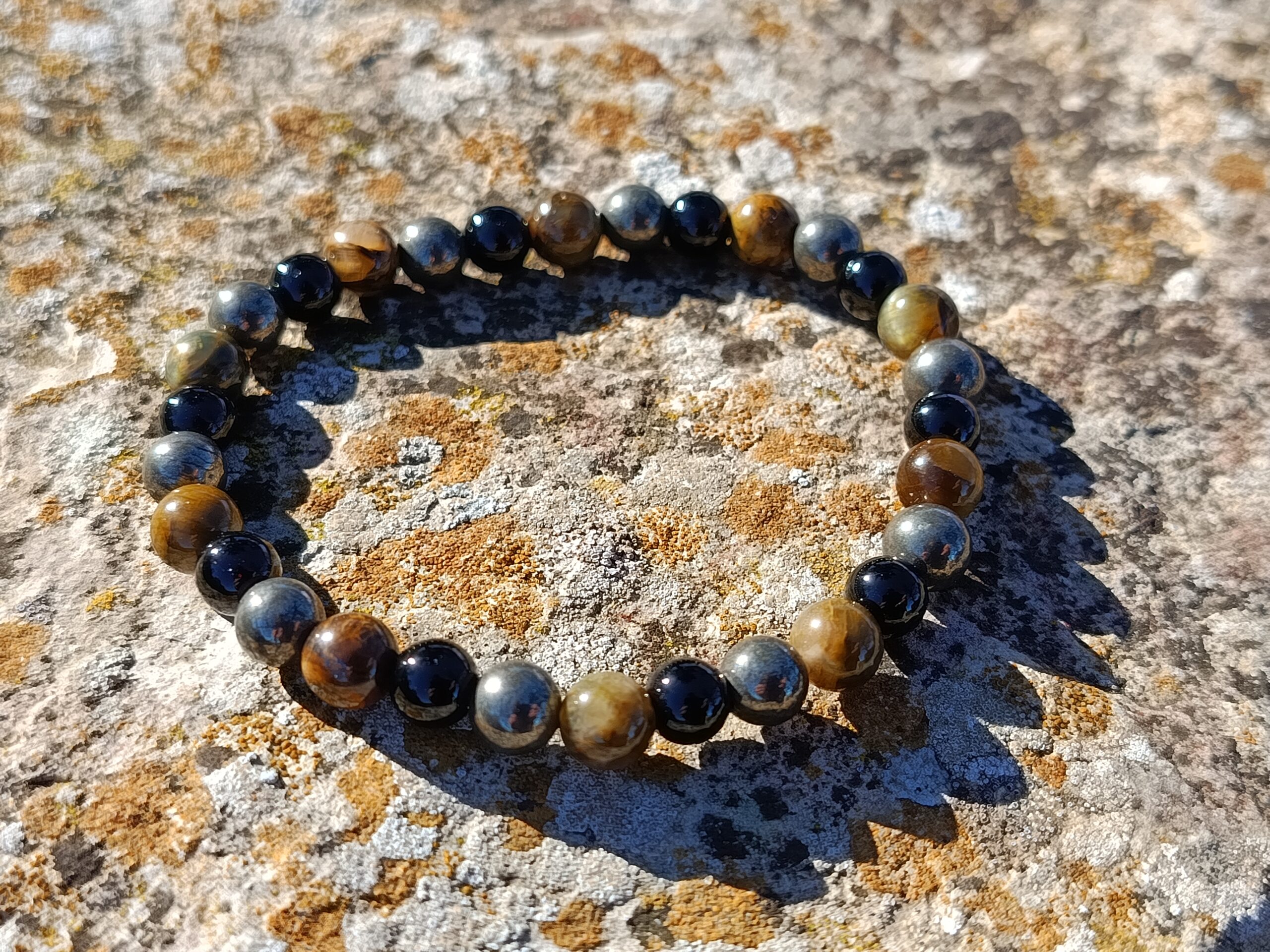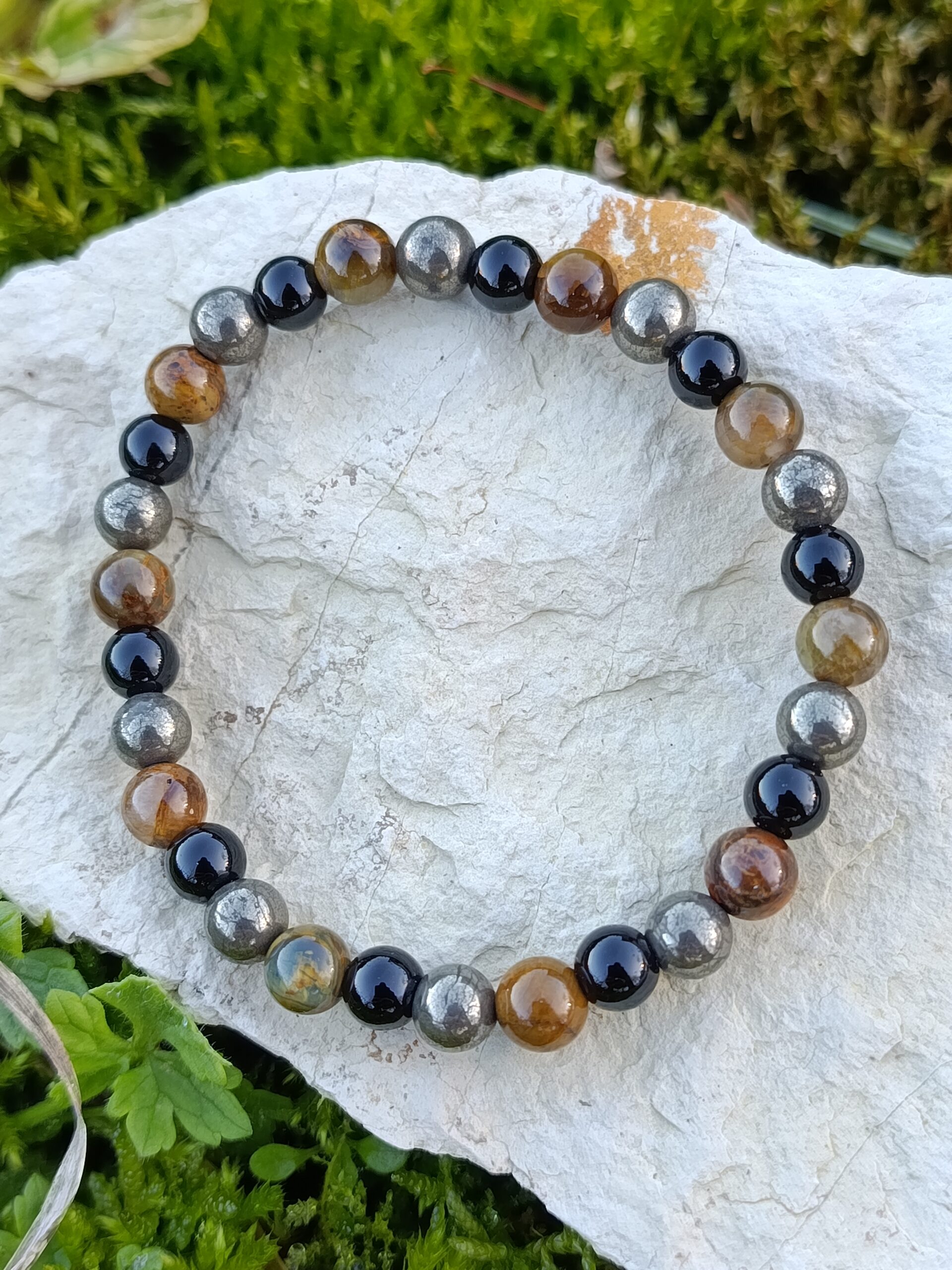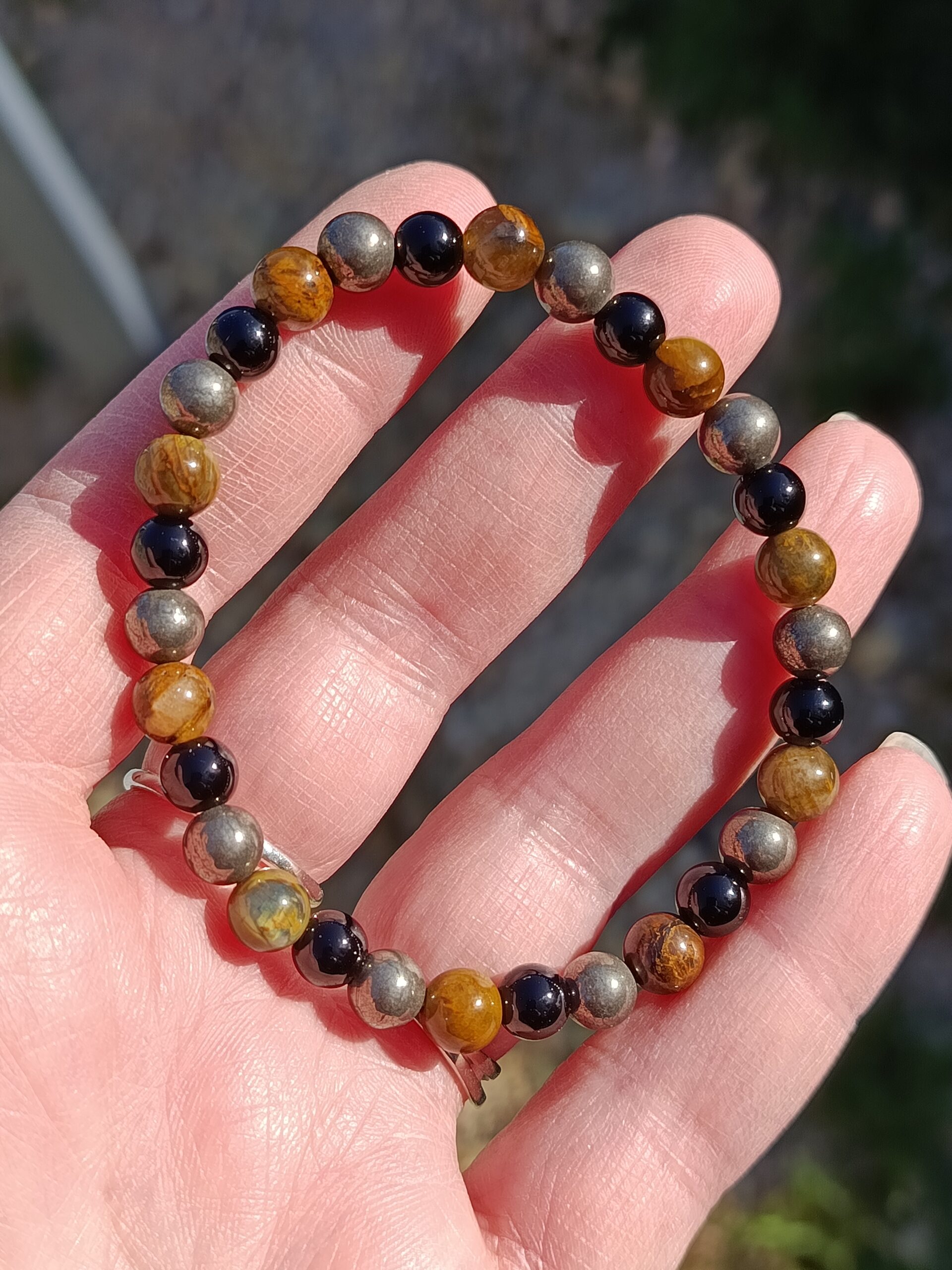 Ce joli mélange de nellite, pyrite et agate noire en perles de 6mm est un intemporel qui ira avec toutes vos tenues ! Avec la chaleur et les nuances de la nellite, le côté métallique et lumineux de la pyrite et l’intensité de l’agate noire, ce bracelet offre beaucoup de contraste qui ira autant avec un style élégant que décontracté.