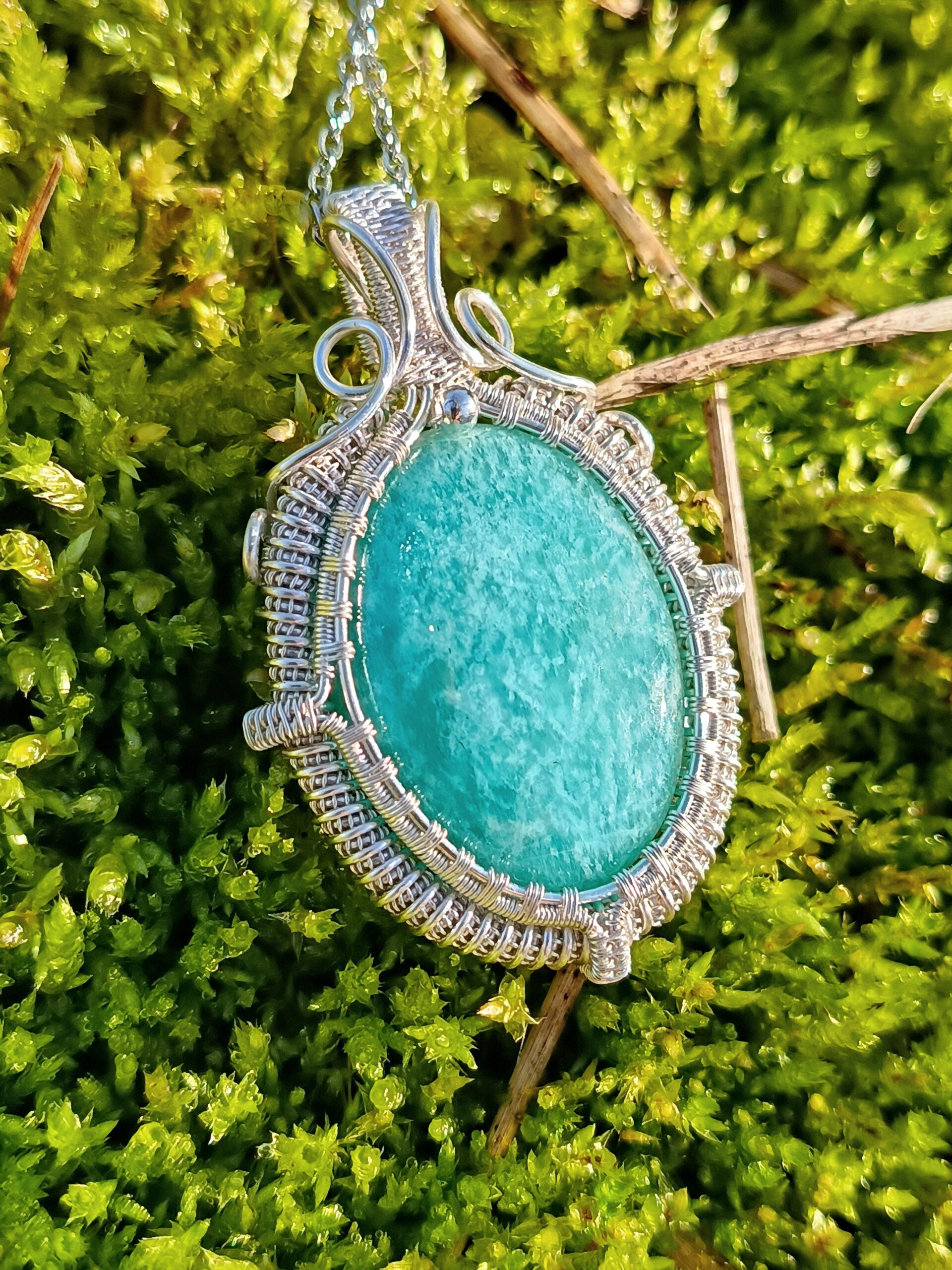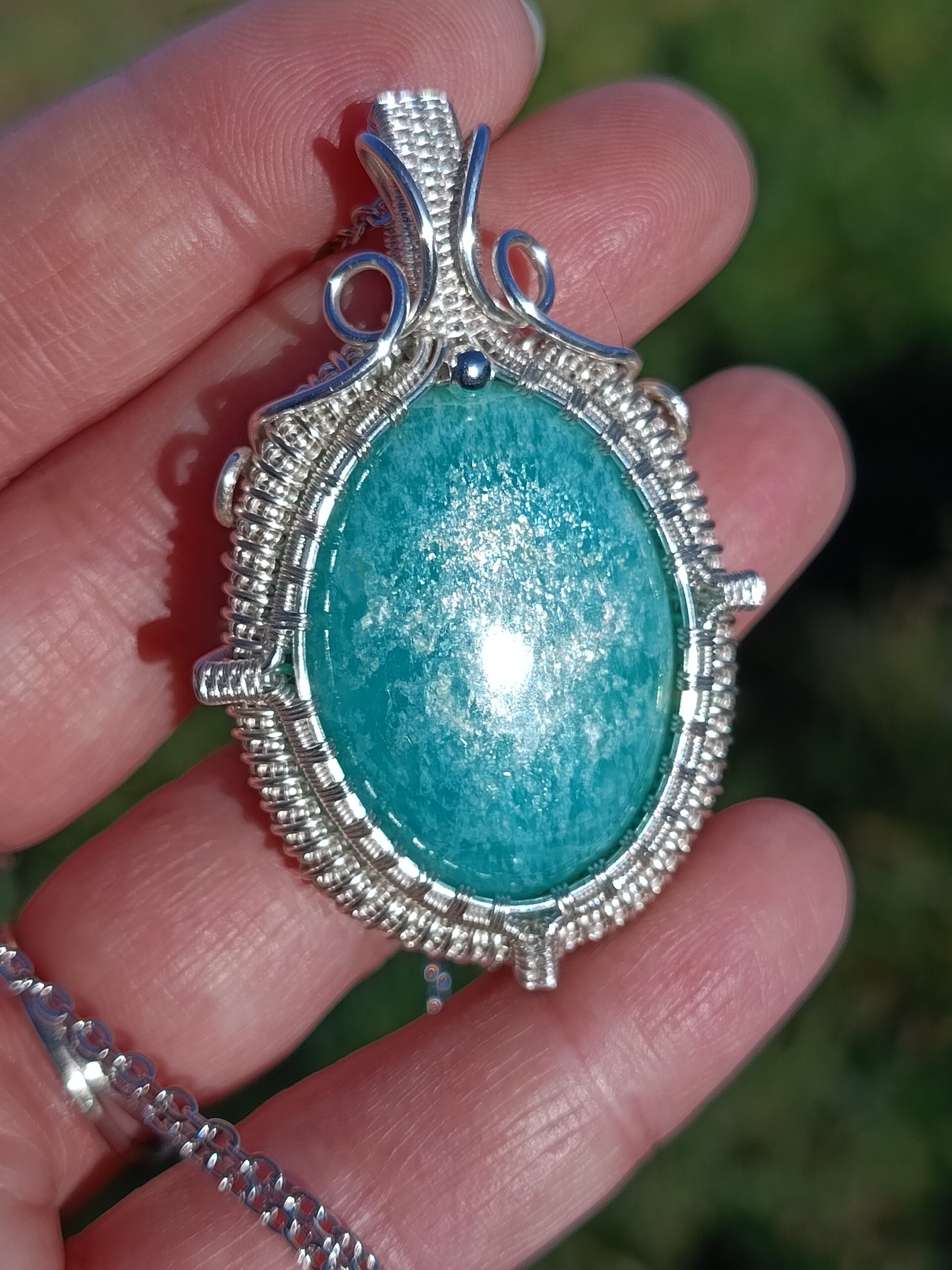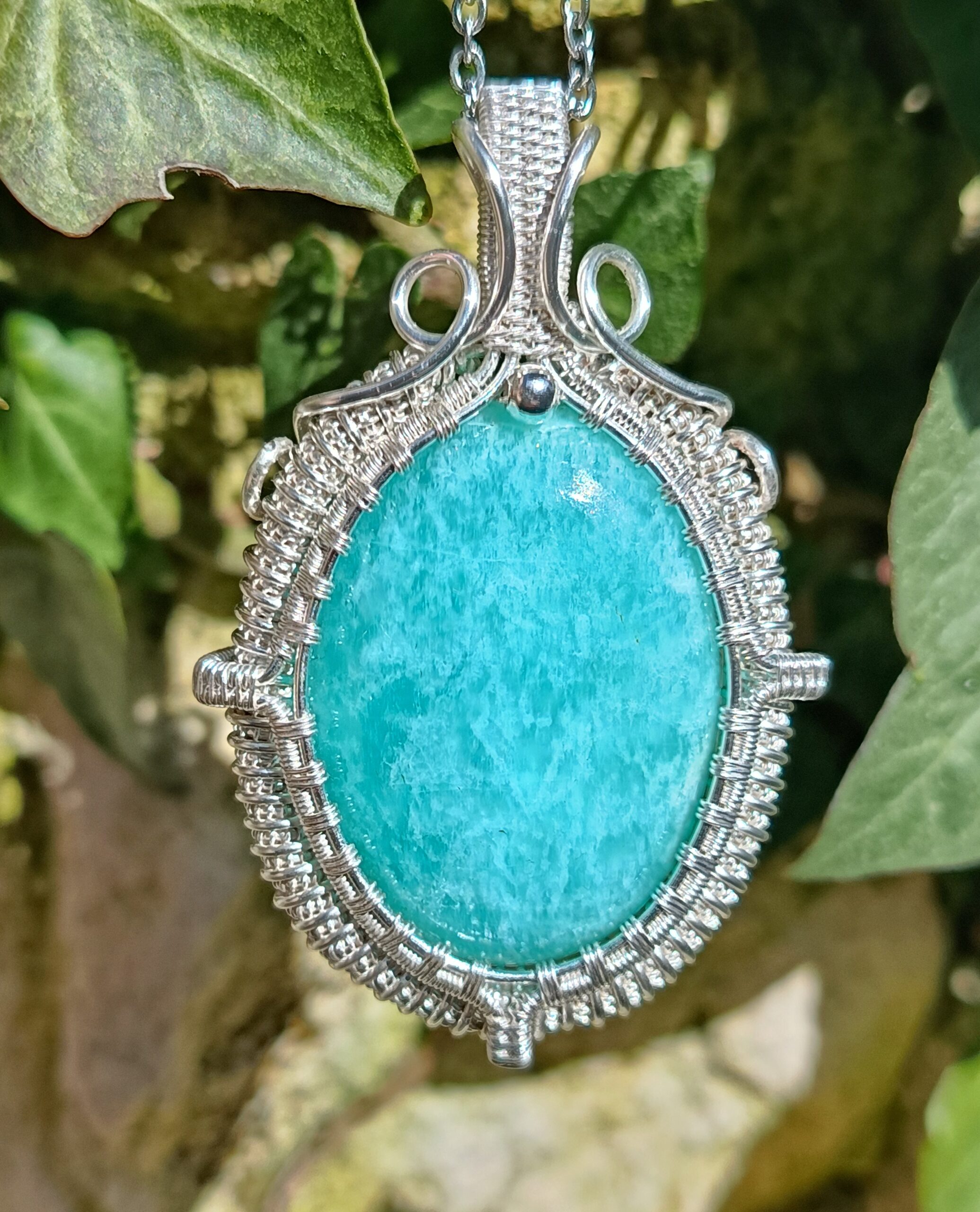 Cet incroyable cabochon possède toutes les qualités recherchées dans l’amazonite : une couleur intense grâce à sa belle épaisseur, de magnifiques reflets argentés ultra présents sur toute la surface de la pierre, et une forme dodue telle un petit bonbon! Réalisé en cuivre plaqué argent dans mon atelier avec un sertissage très recherché pour donner un aspect de « médaillon antique », ce pendentif est une pièce tout à fait exceptionnelle et unique.