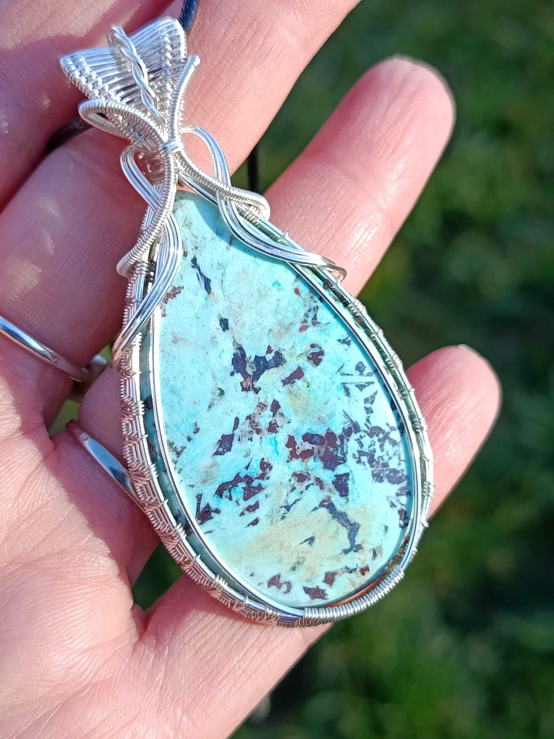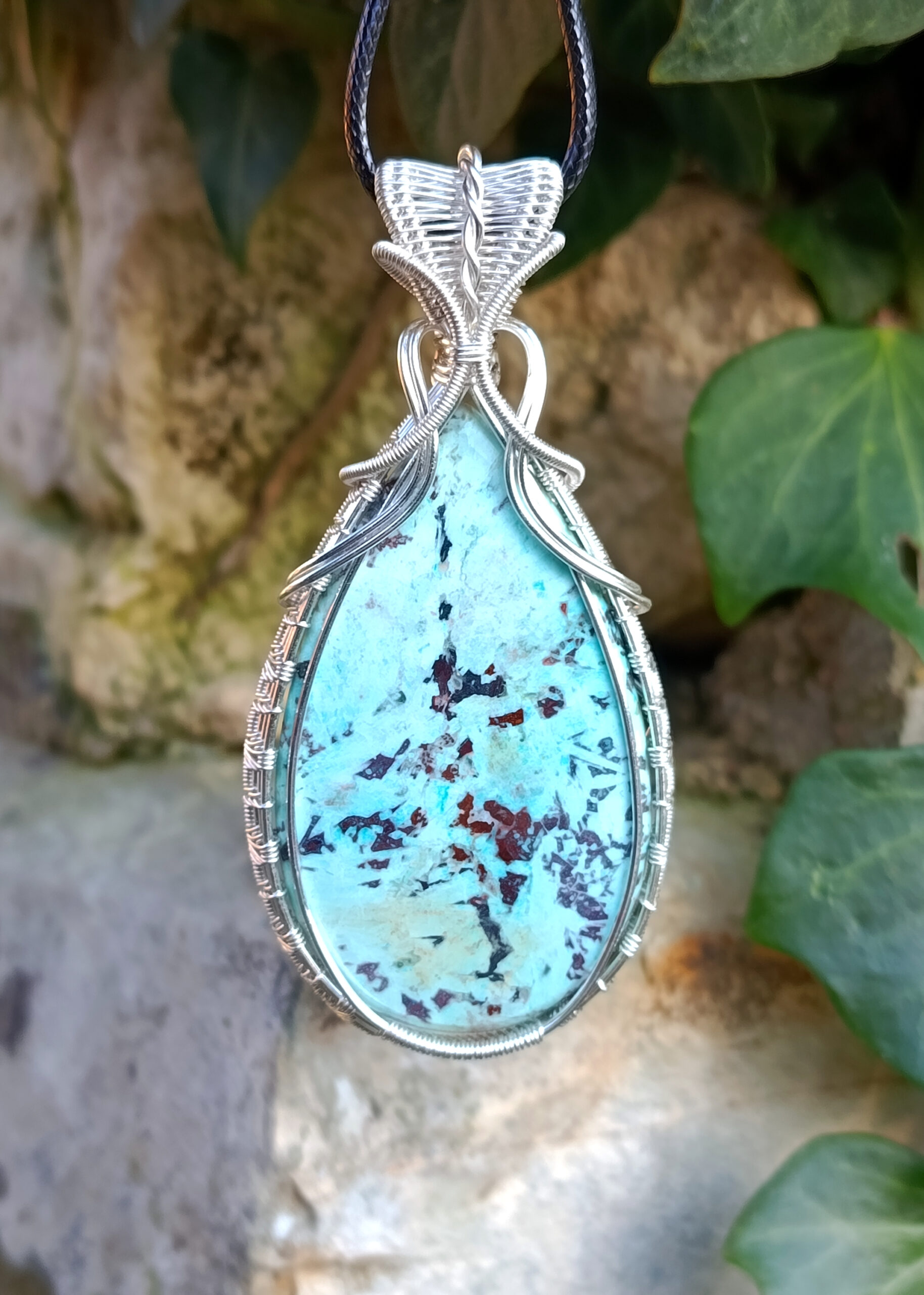 Cet incroyable cabochon de chrysocolle provient du Pérou, et possède une couleur turquoise pâle très douce, qui lui vaut parfois le nom de « turquoise du Pérou ». Parsemé de jolies petites inclusions de cuprite qui créent comme des dessins sur la pierre, ce cabochon est d’une très belle taille et épaisseur, ce qui m’a permis de réaliser un sertissage en cuivre plaqué argent finement tissé sur l’ensemble du pendentif, surmonté d’une bélière majestueuse!