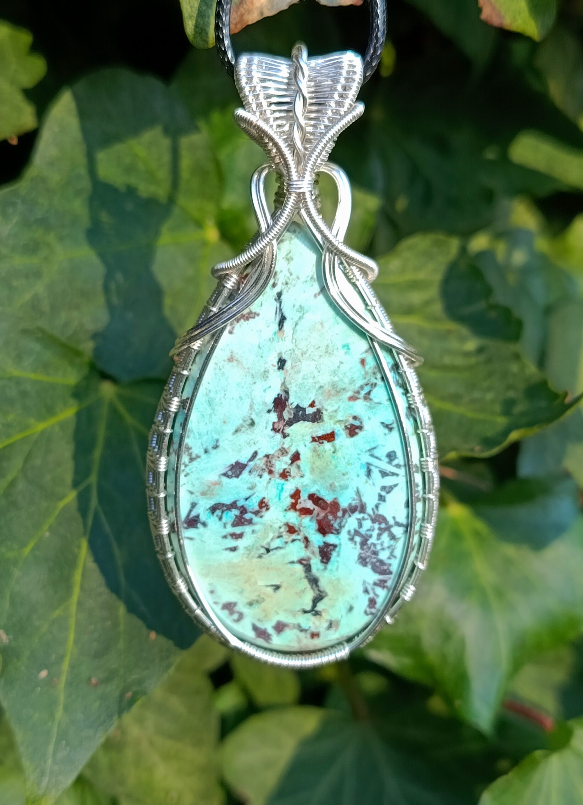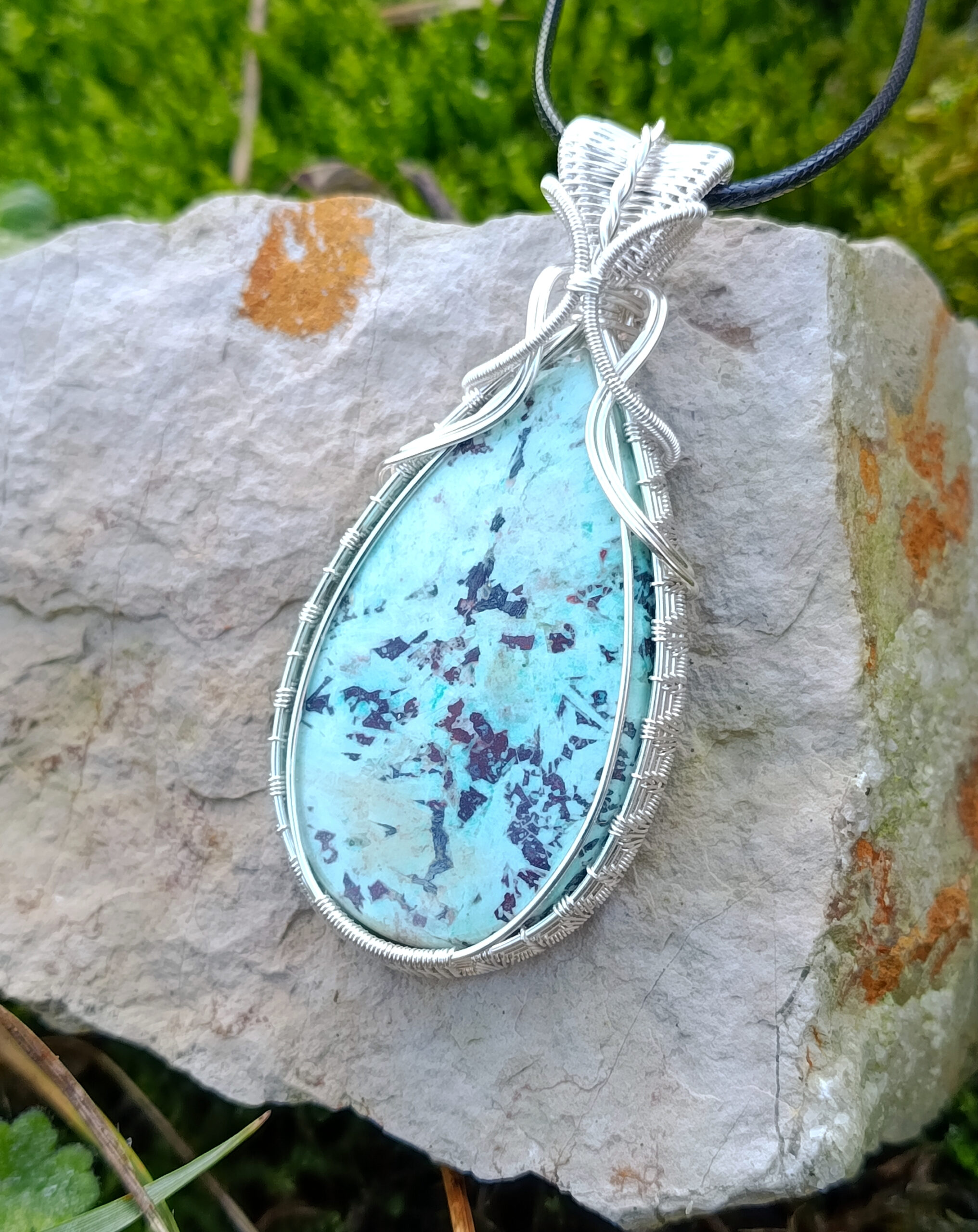 Magnifique pendentif composé d’un grand cabochon de chrysocolle du Pérou serti sur fil de cuivre plaqué argent.