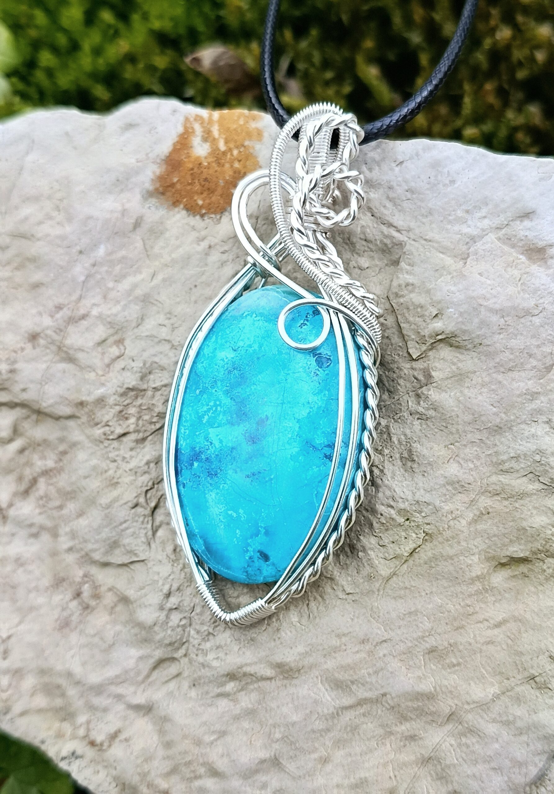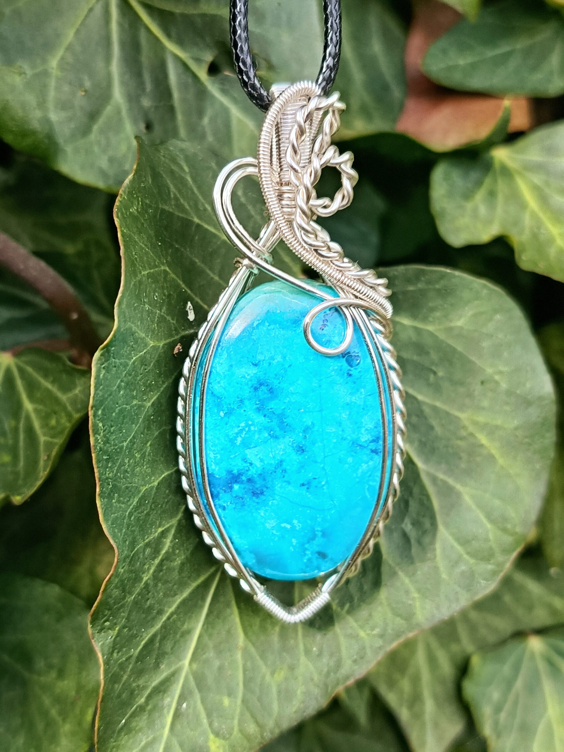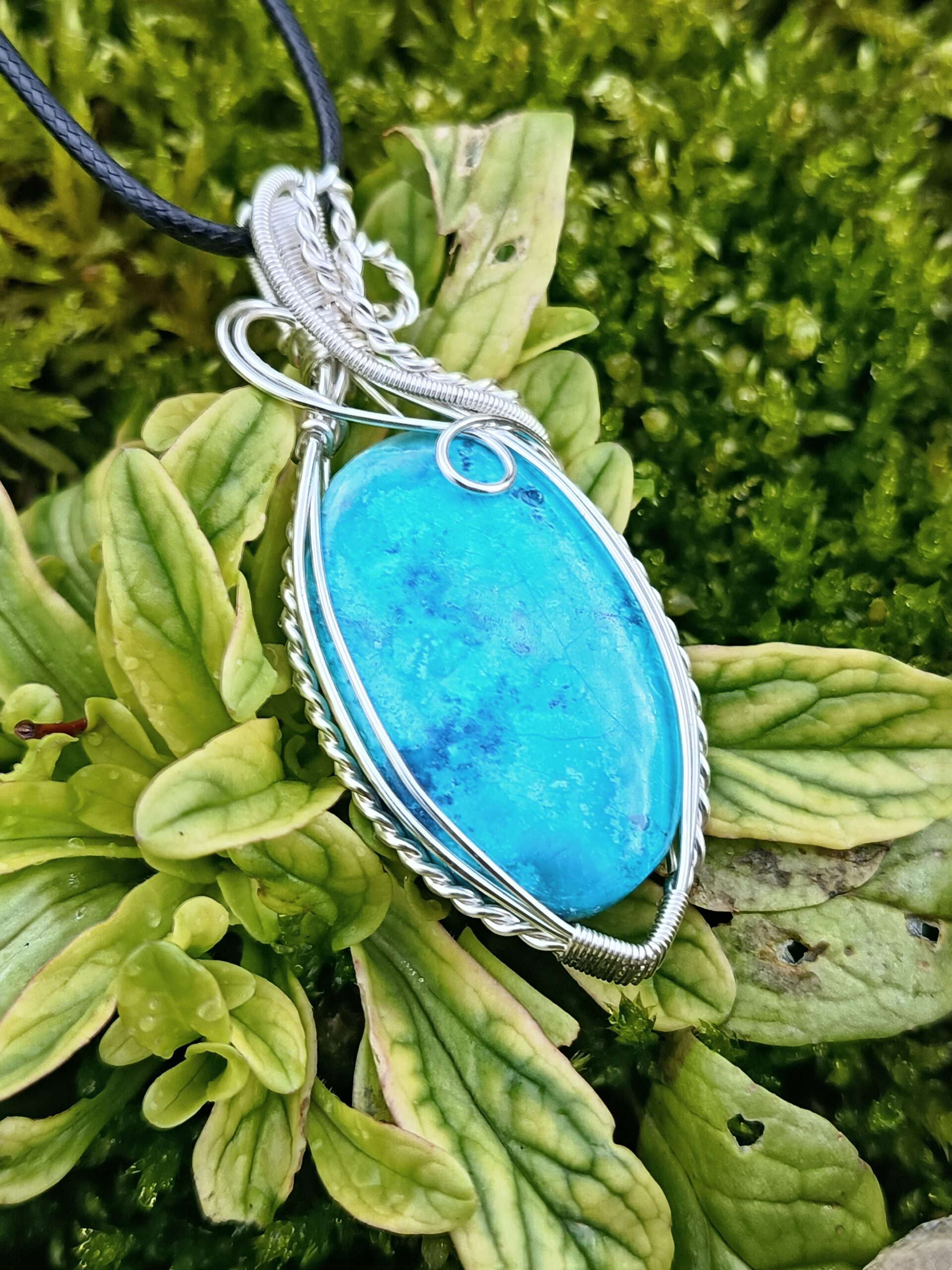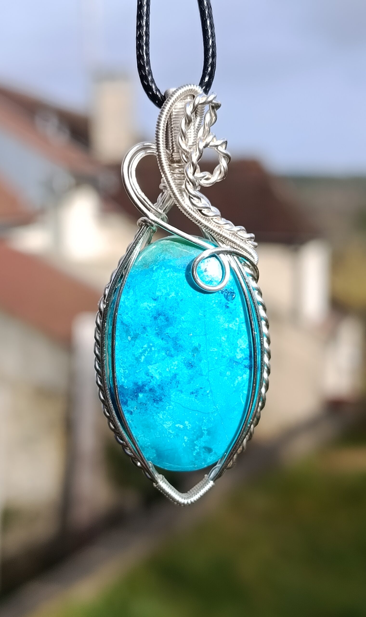 Cet incroyable cabochon de chrysocolle est d’une superbe qualité : une couleur bleue turquoise impressionnante, réhaussée de quelques petites touches de shattuckite bleue foncée. Serti en cuivre plaqué argent, ce cabochon hypnotise par sa couleur et invite au voyage. Plutôt rare à trouver dans cette qualité, ce pendentif n’attend plus que vous !