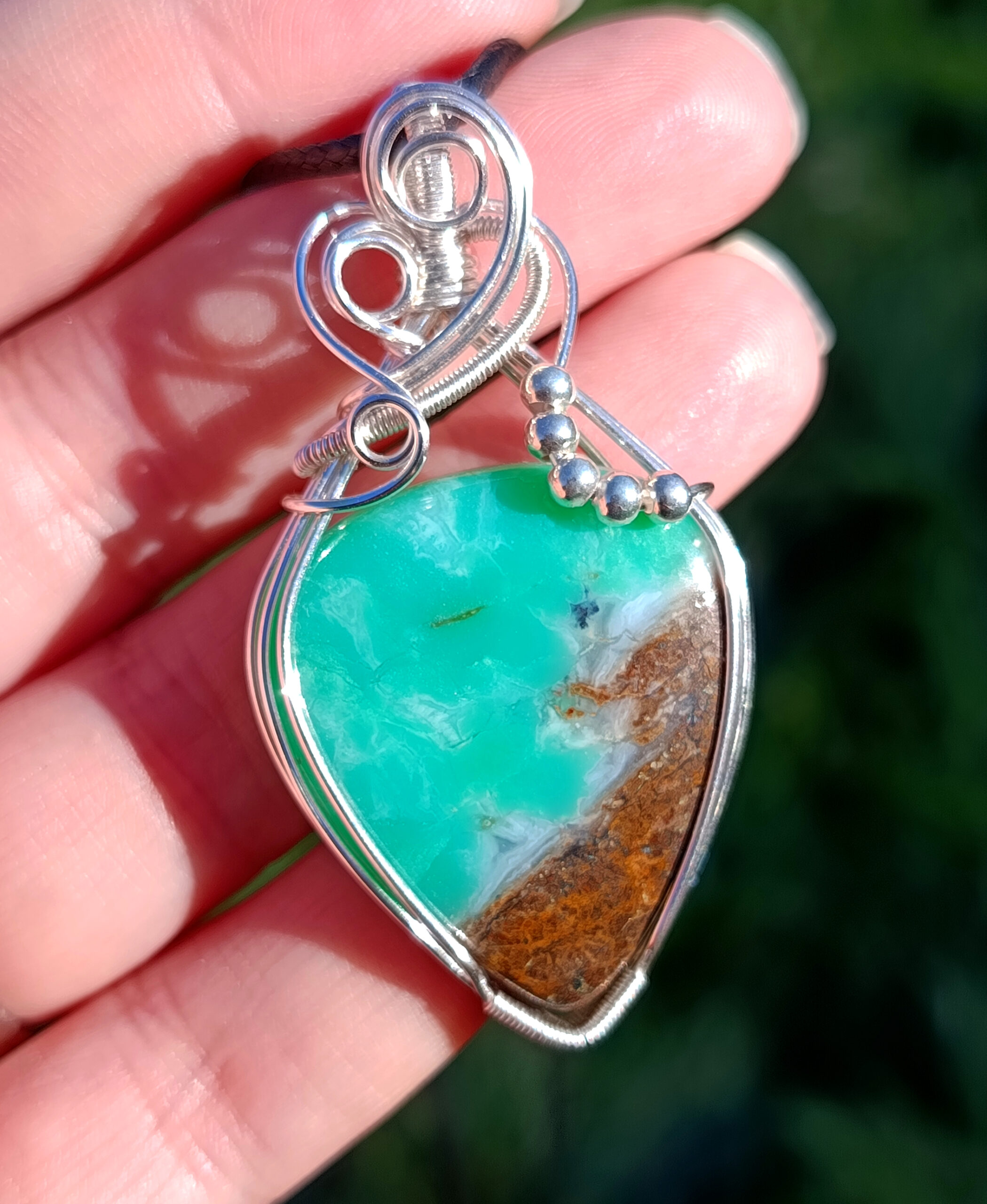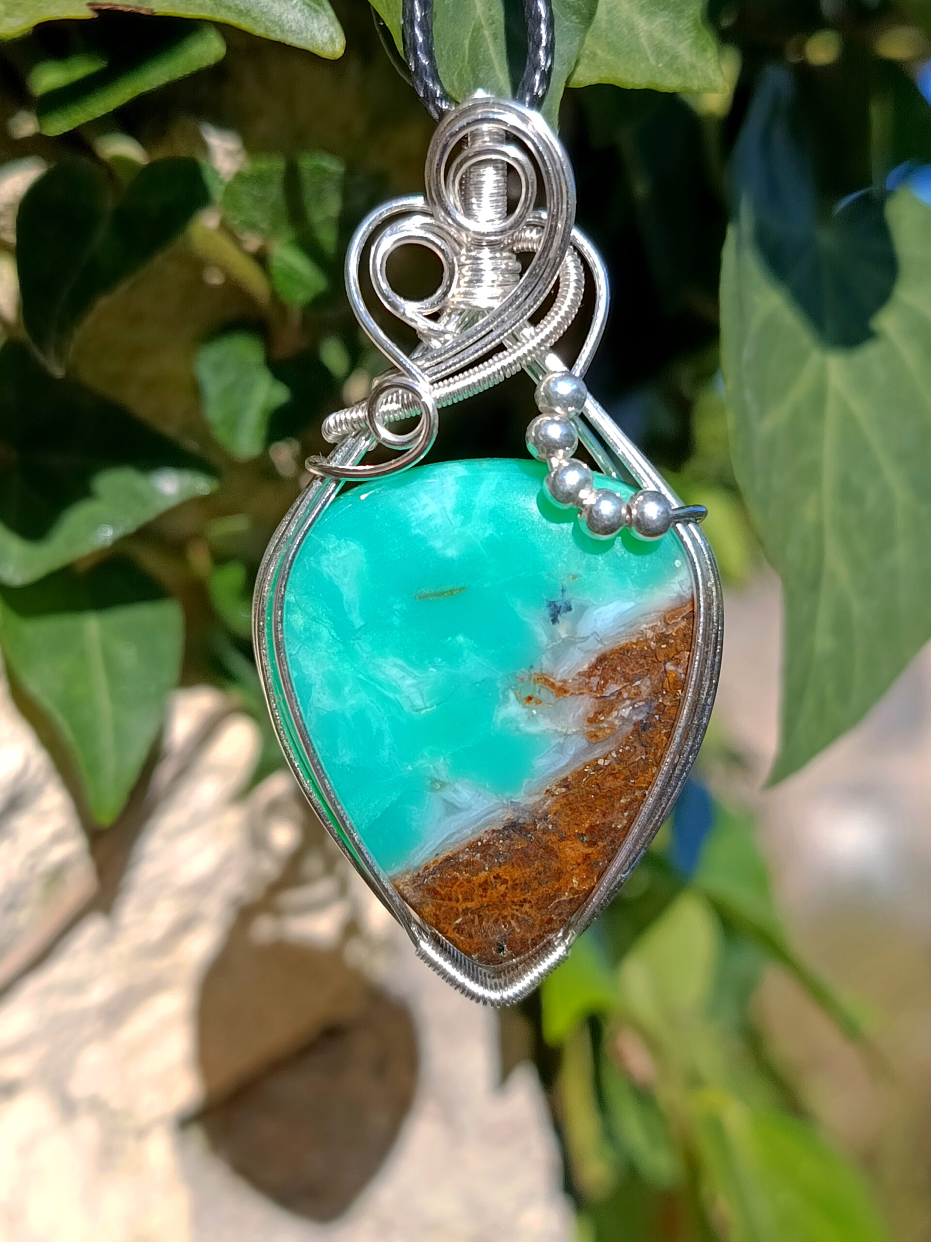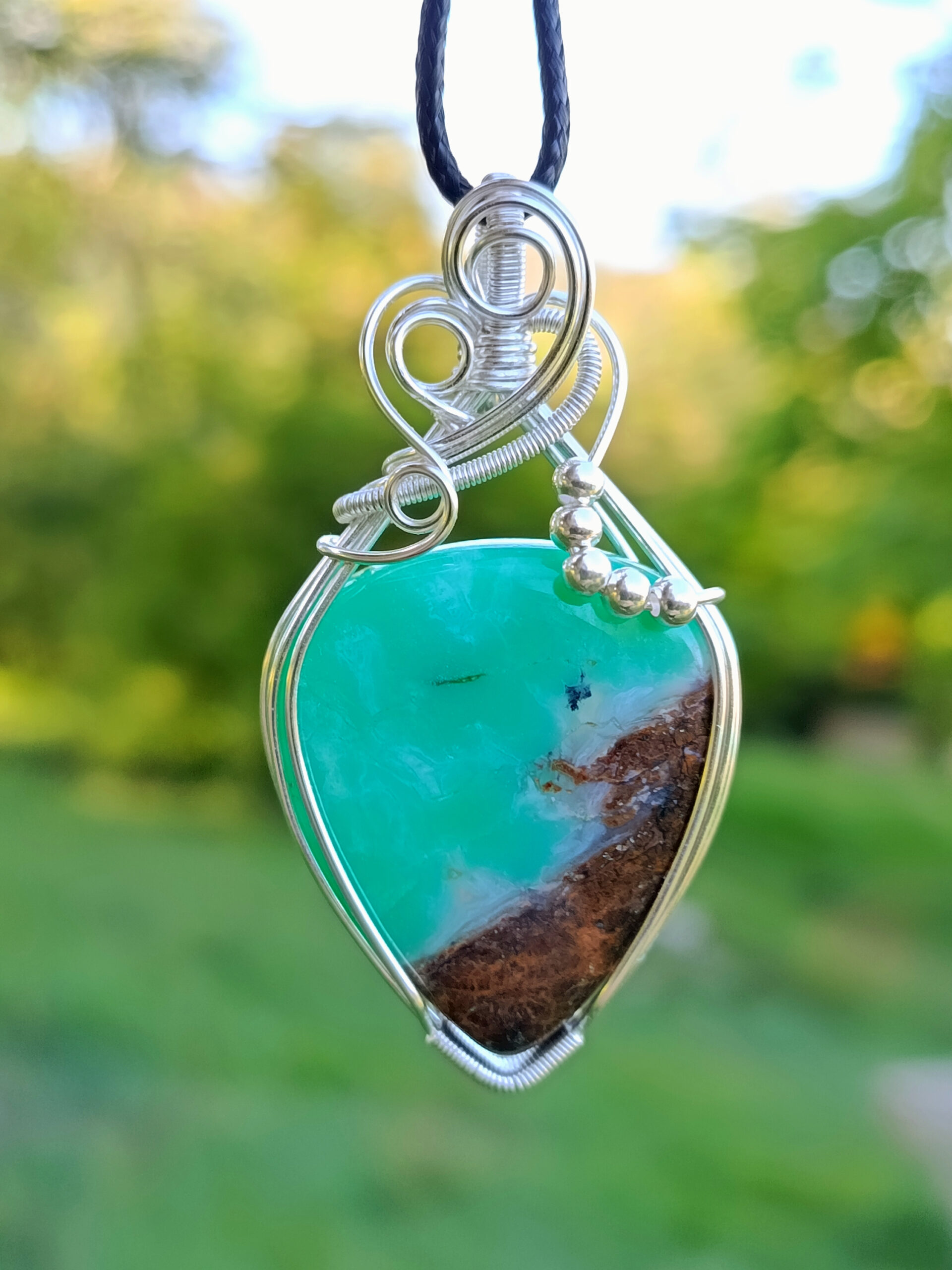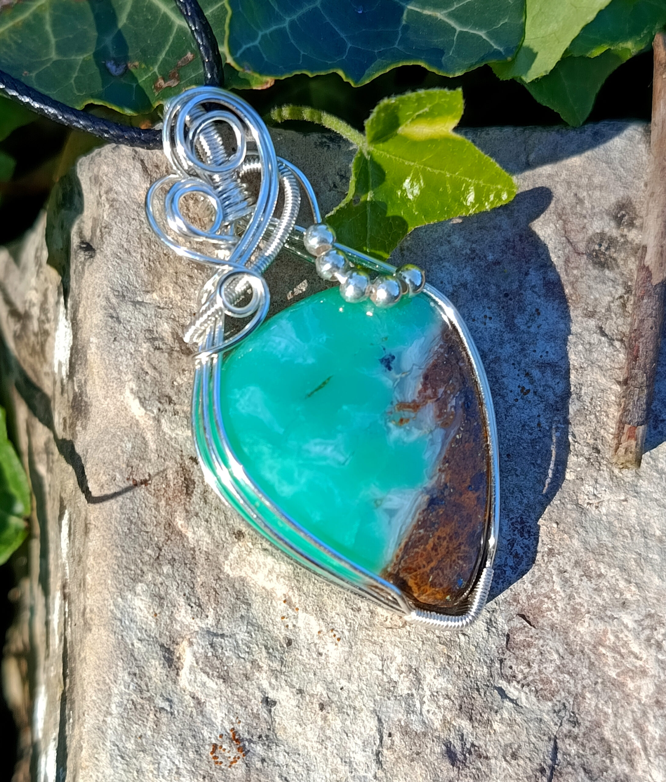 Superbe pendentif composé d’un cabochon de chrysoprase serti sur fil de cuivre plaqué argent.