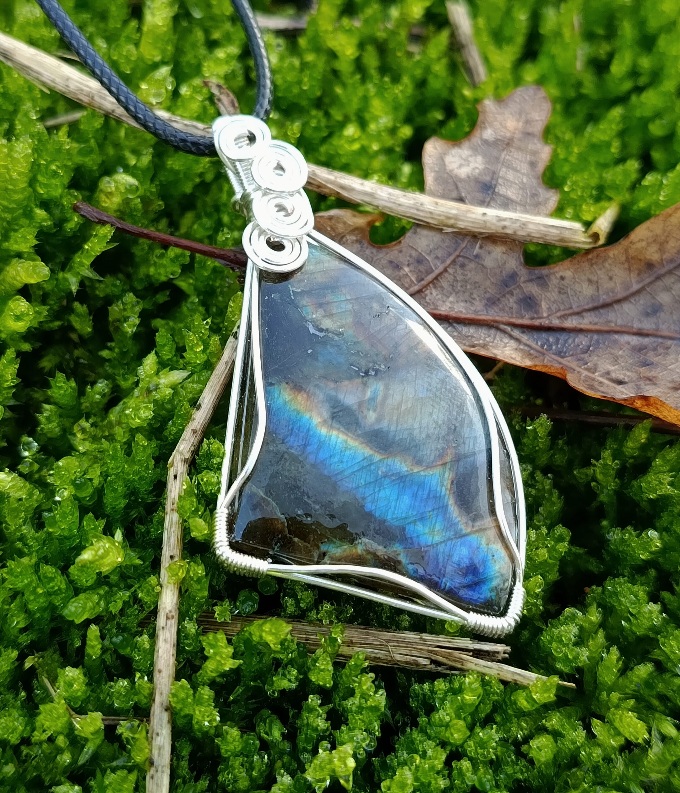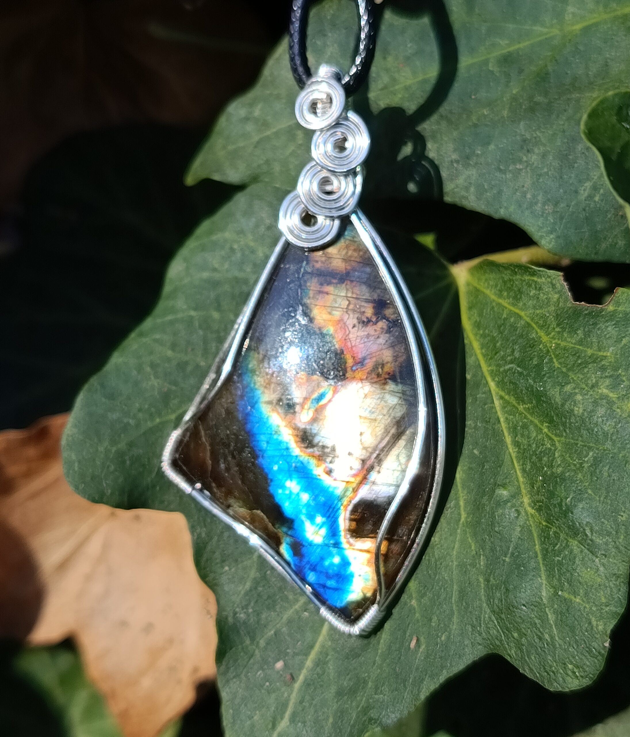 Ce joli cabochon en labradorite possède une forme tout à fait originale et unique. Avec ces beaux reflets multicolores très mystérieux dont une bande bleue électrique très marquée, il a été serti de façon sobre et élégante en cuivre plaqué argent afin de pouvoir être porté tous les jours et avec toutes vos tenues !
