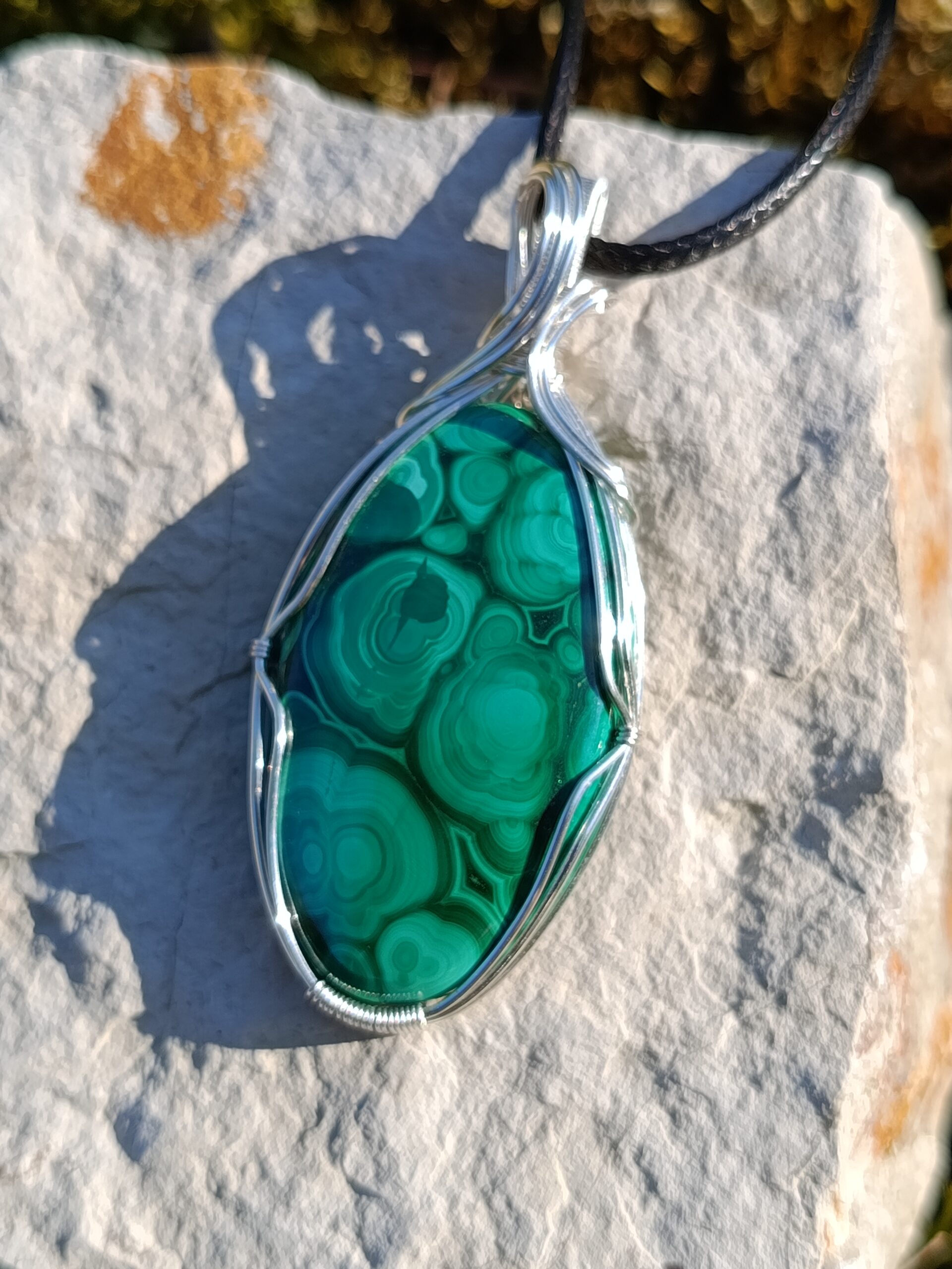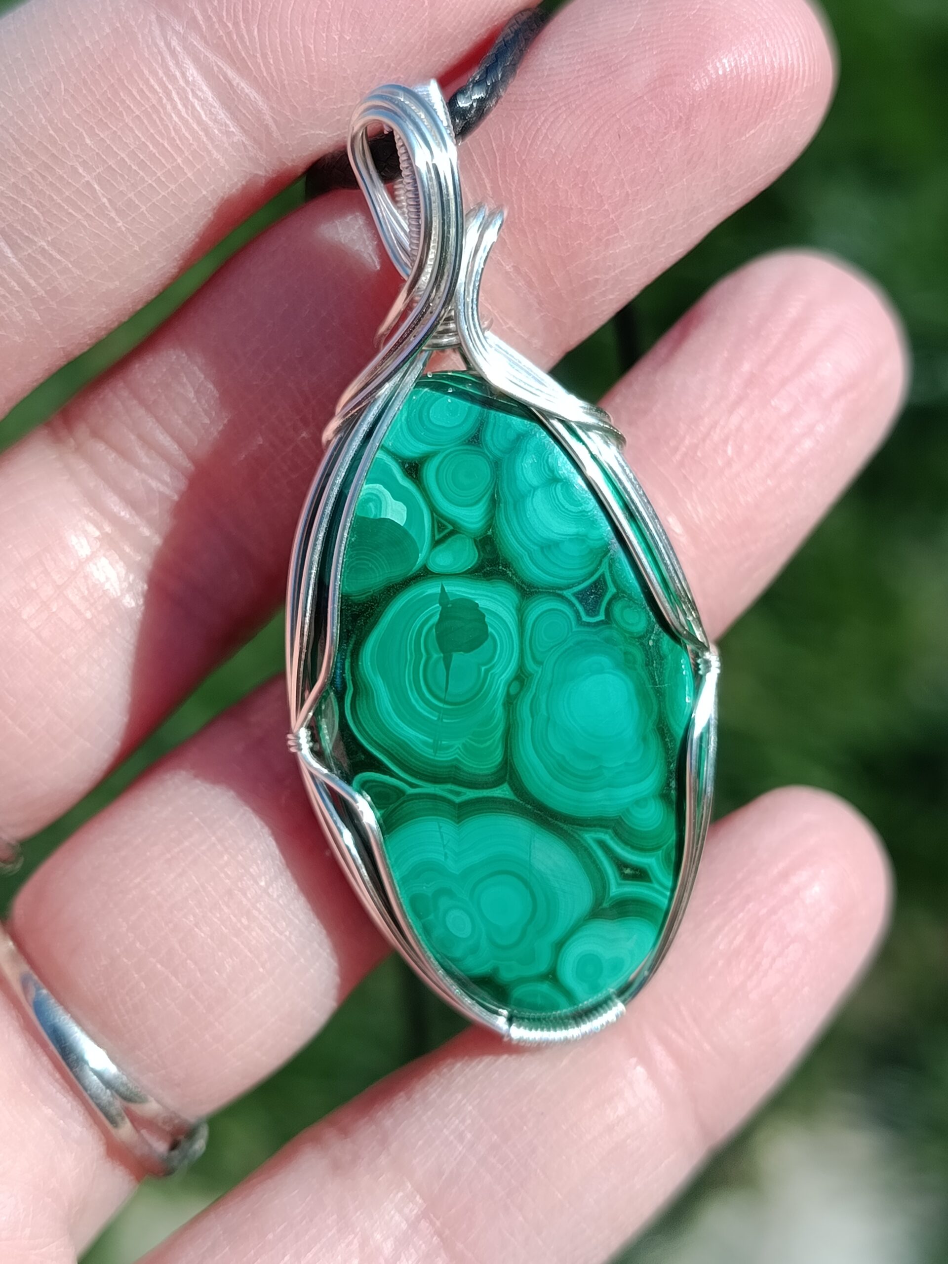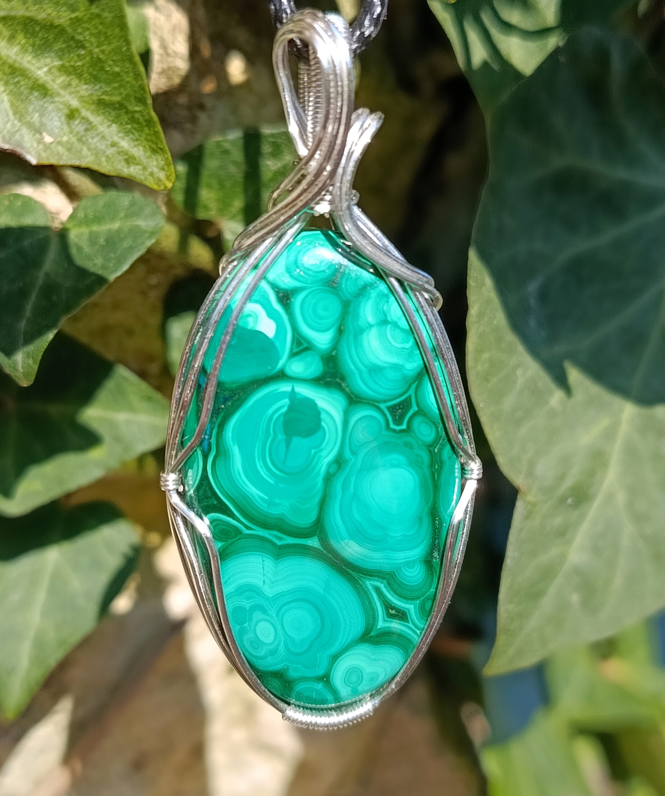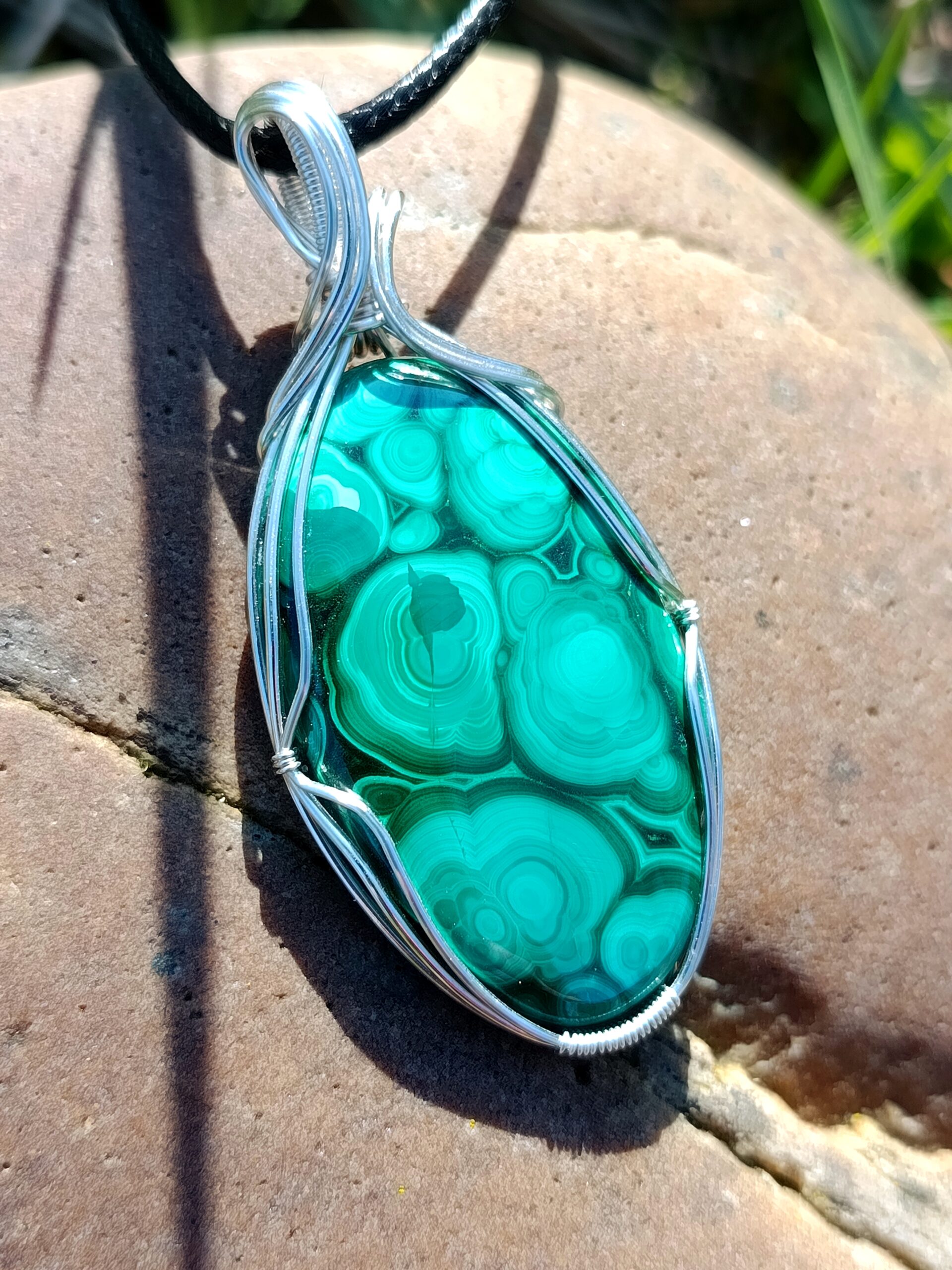 Ce très beau cabochon de malachite possède beaucoup de motifs détaillés et délicats. D’une taille « passe partout » ni trop petit ni trop gros, et serti avec simplicité en fil de cuivre plaqué argent, il pourra facilement être porté tous les jours avec toutes vos tenues!