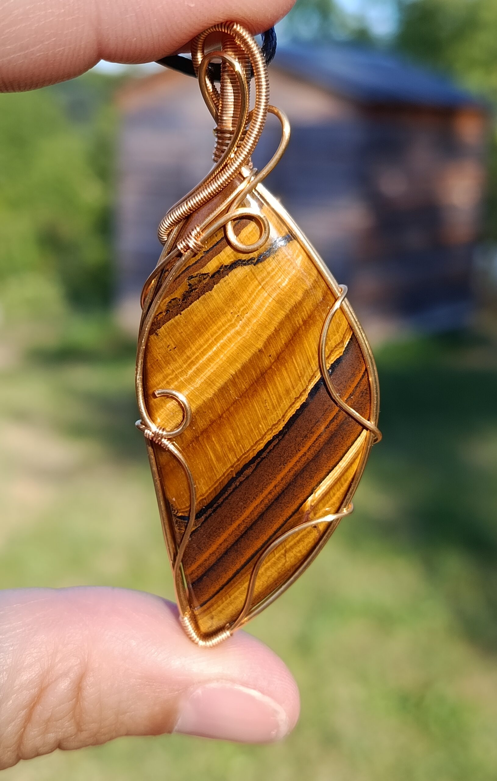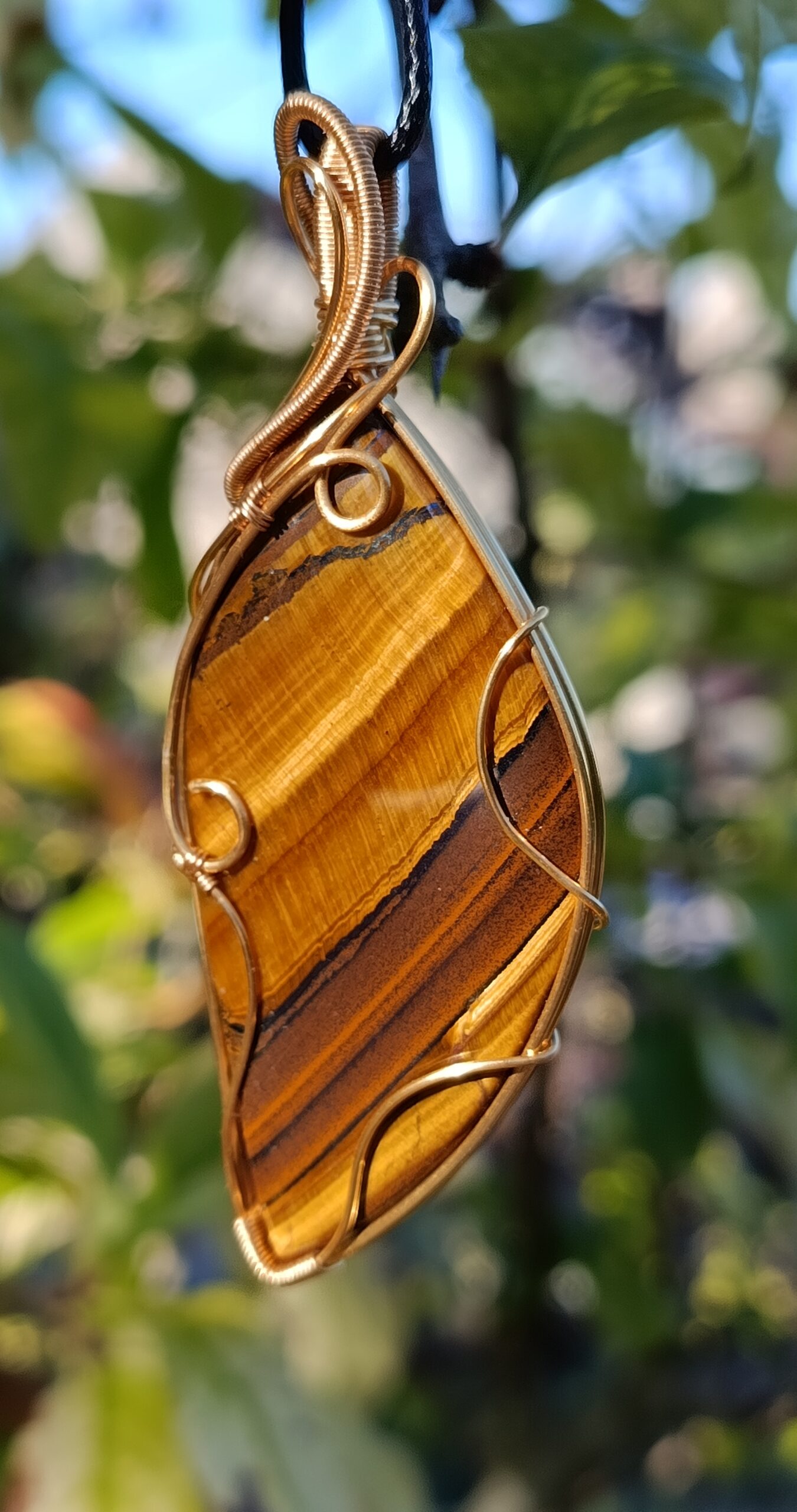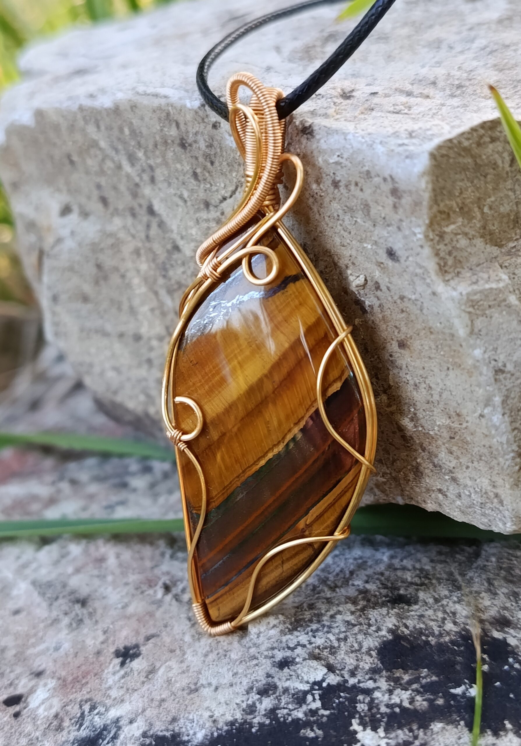 Magnifique pendentif composé d’un grand cabochon d’oeil de tigre serti sur fil de cuivre doré