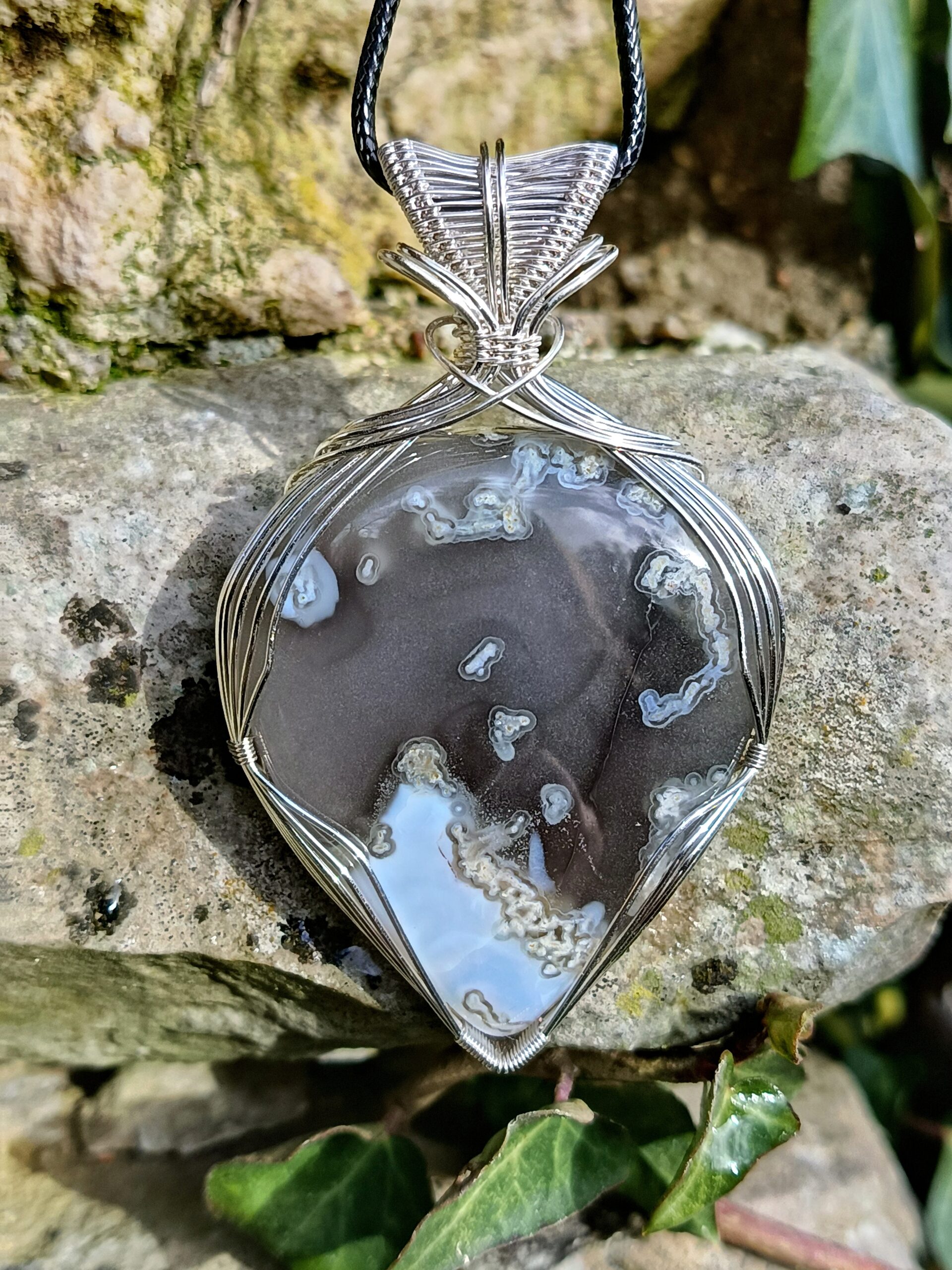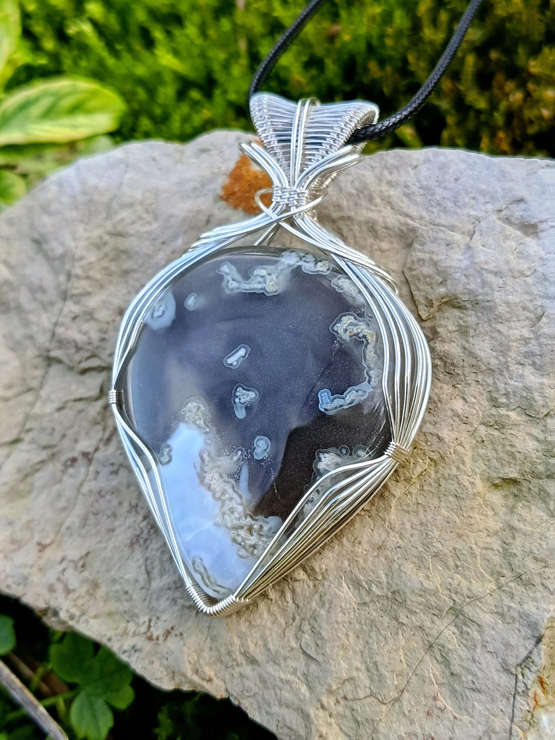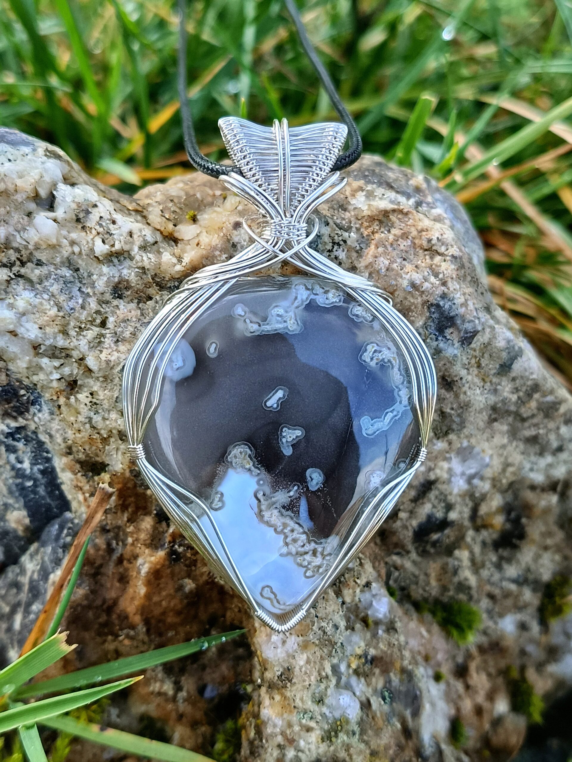 Magnifique pendentif composé d’un grand cabochon d’opale owyhee serti sur fil de cuivre plaqué argent.
