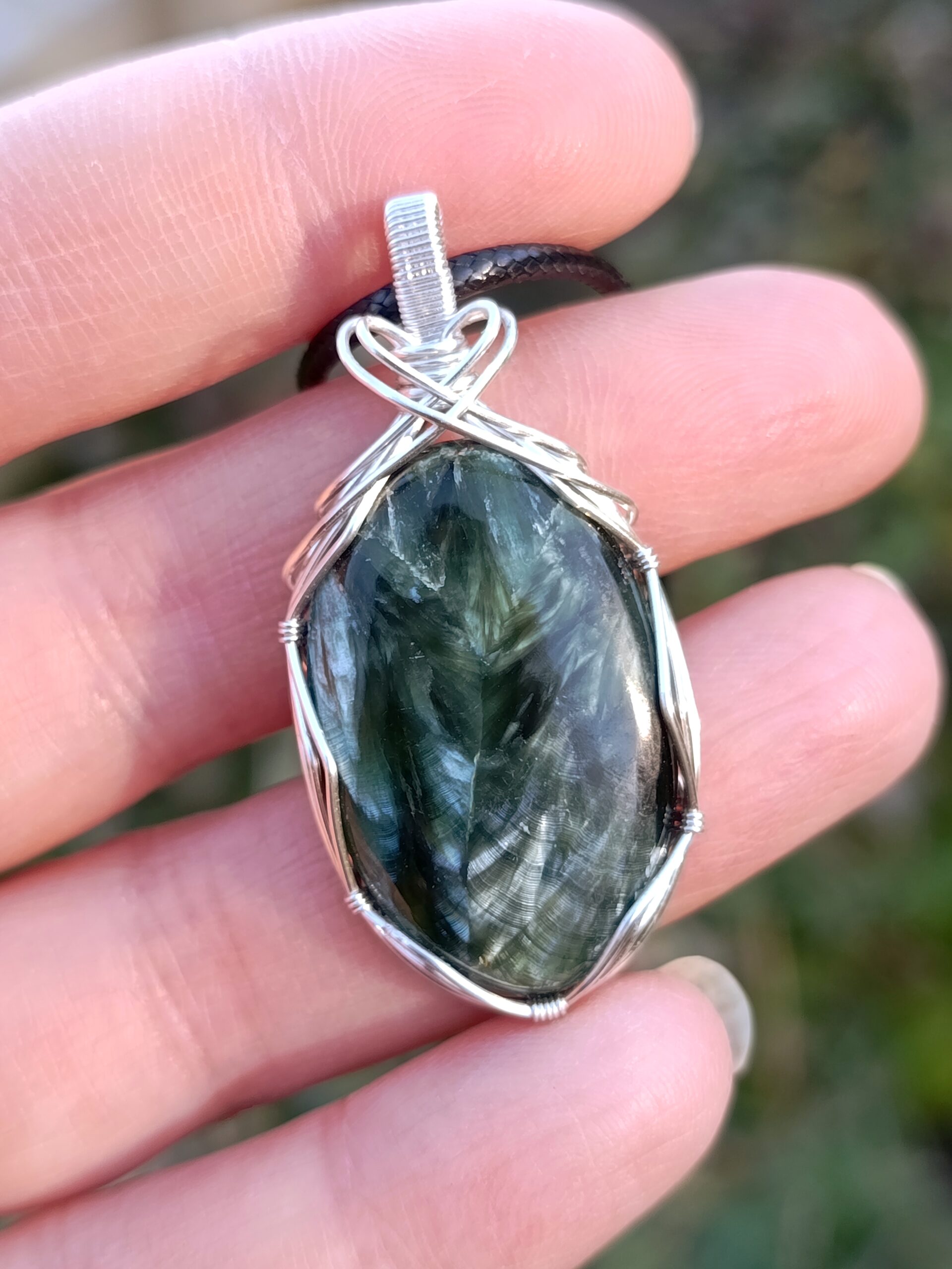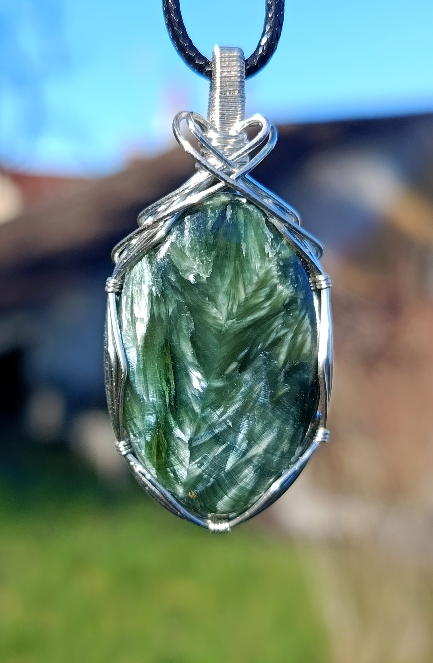 Variété relativement rare de la famille des chlorites, le terme séraphinite est en réalité un nom commercial donné à la pierre issue d’une forme particulière de clinochlore verte. En effet, ses longs filaments argentés qui parsèment la pierre évoquait pour certains les ailes d’un Séraphin, créature céleste que l’on retrouve dans certains textes religieux. Composée d’aluminosilicate de magnésium et de fer, les principaux gisements de séraphinite se trouvent en Russie, près du lac Baïkal. Sa belle couleur verte aux reflets argentés et sa rareté en font une pierre recherchée par les collectionneurs.