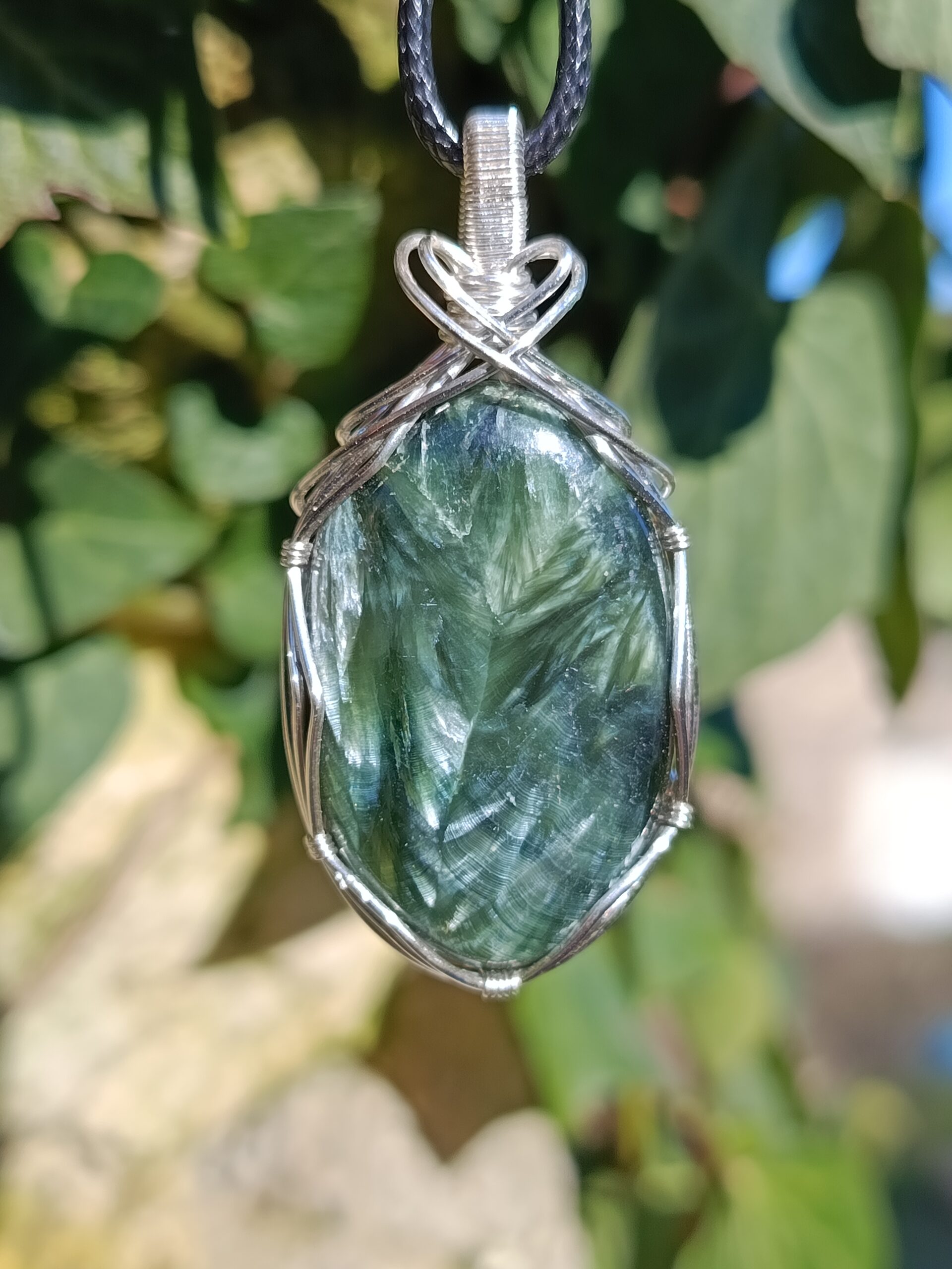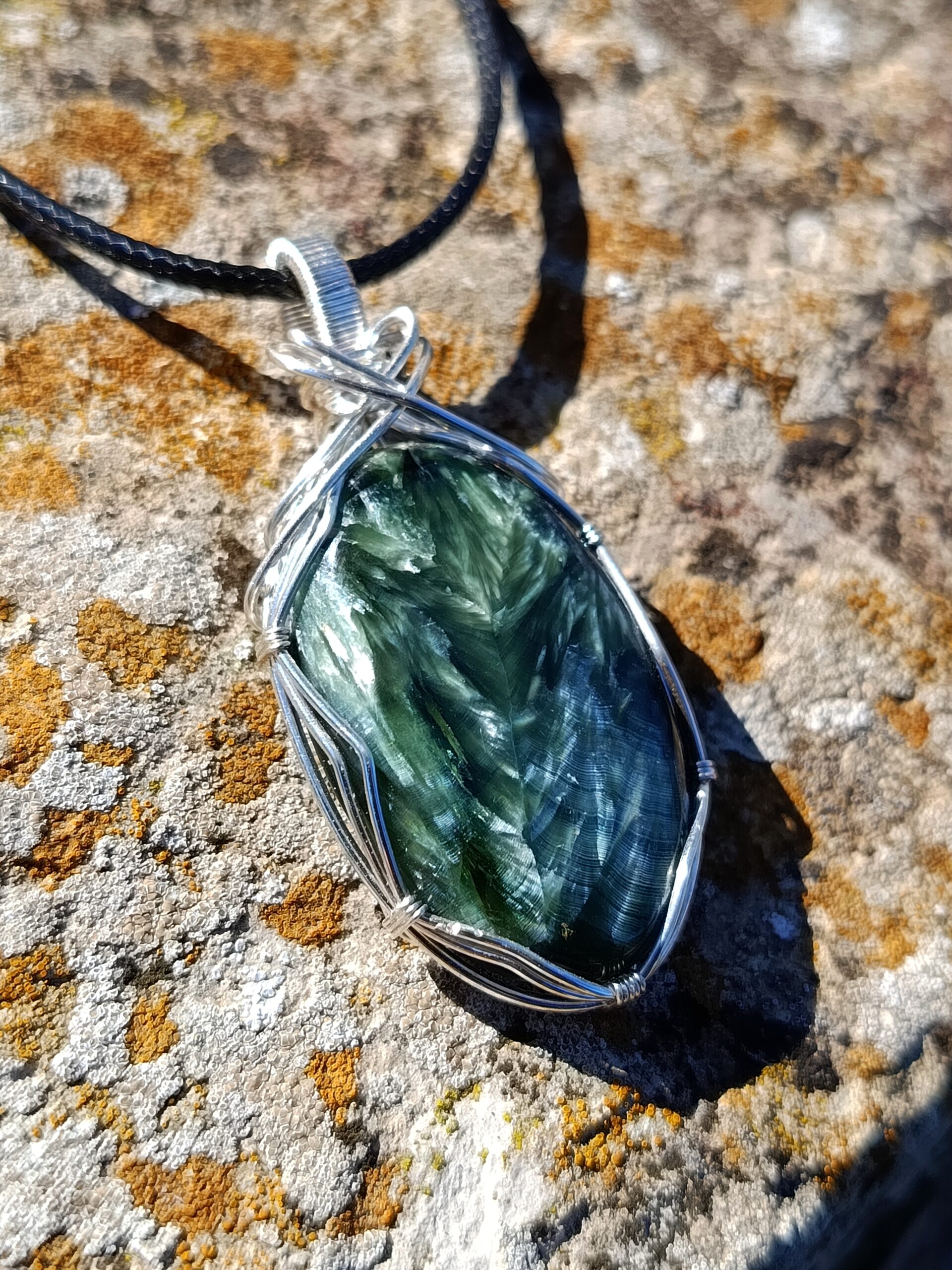 Ce magnifique cabochon en séraphinite est d’une superbe qualité : peu courant, il possède une superbe couleur verte mais également les jolis motifs argentés « ailé » tant recherché chez ce minéral. Serti en cuivre plaqué argent de façon sobre et délicate, ce pendentif ravira tous les passionnés des pierres rares et recherchées!